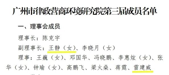 近日,广州市律政营商环境研究院完成了换届工作,并公布了第三届成员名单。其中,广东诺臣律师事务所(以下简称“诺臣所”)管委会常务副主任王静律师任职理事会副理事长,监事会主席雷建威律师任职理事会理事。