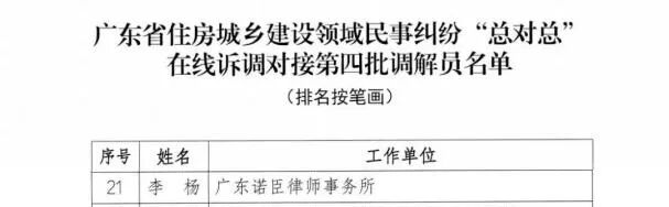 经广东省住房城乡建设厅审核,住房城乡建设部备案后,广东诺臣律师事务所一级合伙人李杨律师入选为广东省住房城乡建设领域民事纠纷“总对总”在线诉调对接第四批调解员,并由最高人民法院确认纳入人民法院调解平台,调解范围为建设工程合同。