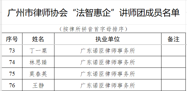 为深入贯彻落实国家关于经济社会高质量发展的战略部署,积极响应广州市推进“12218”现代化产业体系建设的需求,广州市律师协会近期组织开展了“法智惠企”讲师团的组建工作。按照工作程序和要求,确定了广州市律师协会“法智惠企”讲师团成员并公布了名单。其中,广东诺臣律师事务所管委会常务副主任、高级合伙人王静律师,高级合伙人林思臻律师,一级合伙人莫春英律师,合伙人丁一粟律师成功入选。