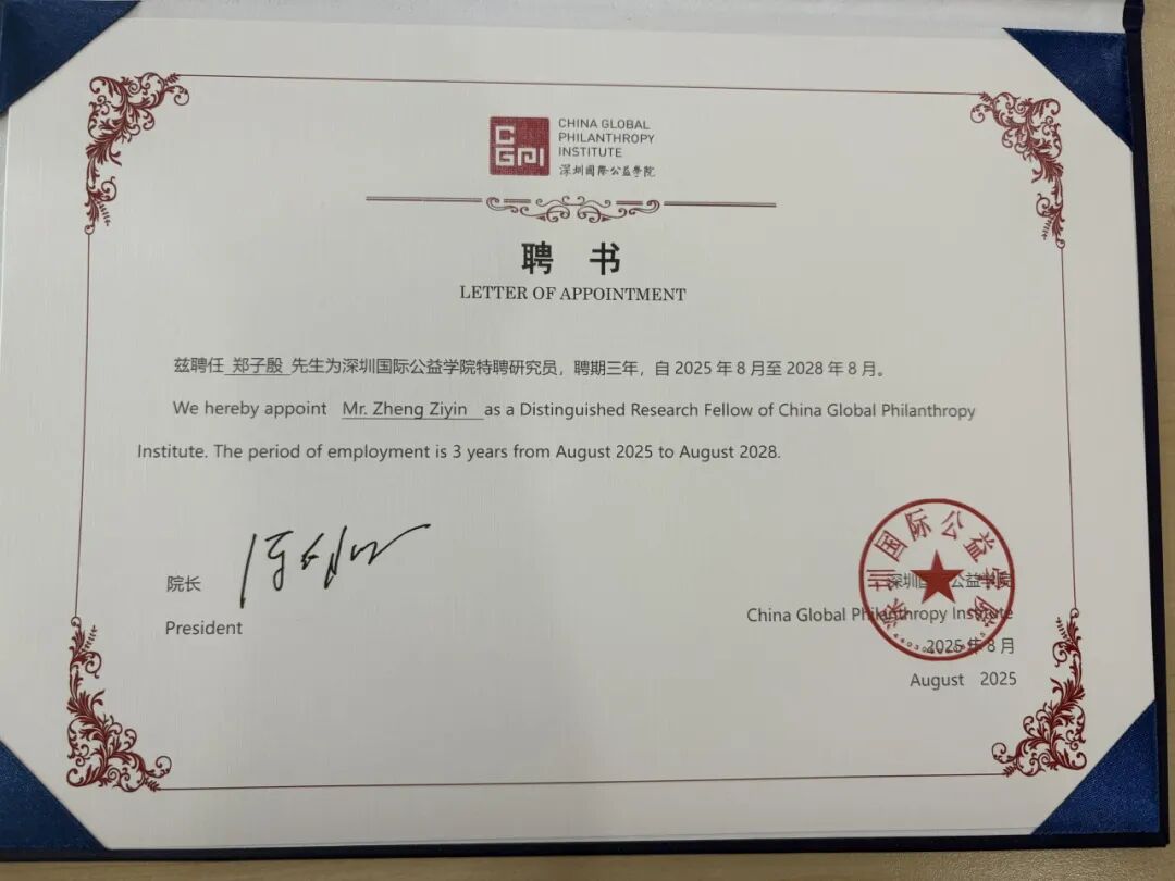 2025年8月1日,深圳国际公益学院EMP国际公益管理二十一期开学典礼于深圳举行。值此学院迈入十周年的重要节点,典礼上,广东诺臣律师事务所高级合伙人、EMP十期校友郑子殷律师等六人获聘为首批“特聘研究员”,此机制旨在汇聚学界与实务界顶尖智慧,推动公益慈善理论研究与行动实践的深度融合。