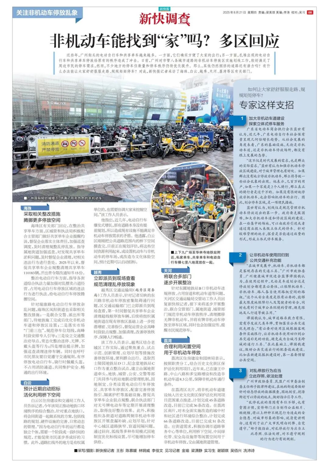 近些年,广州街头的电动自行车和共享单车越来越多。一方面,它们确实方便了大家的出行;另一方面,扎堆出现的电动自行车和共享单车停放给原有的秩序造成了冲击。日前,广州对市管八条城市道路的非机动车停放区实施划线工作,较好满足了周边市民的停车需求,然而,不少地方的停车位数量和停车秩序仍待优化提升。那么,其他仍然拥挤的道路还有潜力吗?有什么办法能让大家舒舒服服走路、规规矩矩停车?