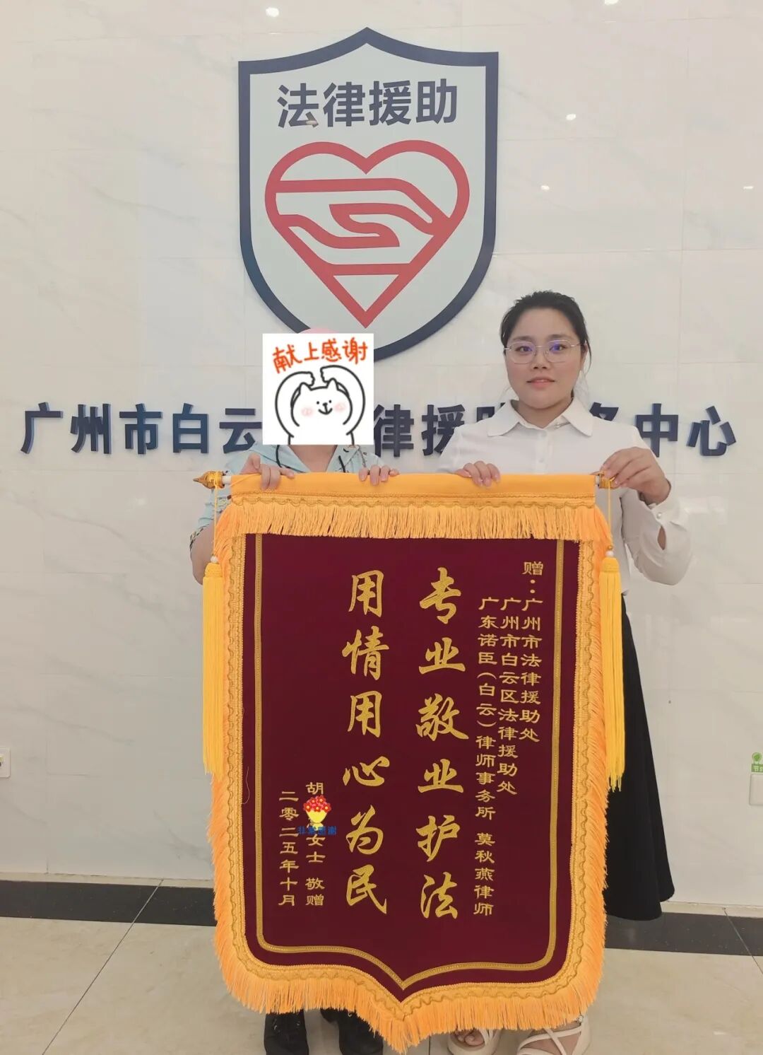 尤为荣幸的是,案件结束后,当事人家属专程为莫律师及法律援助机构送来锦旗。当事人及家属对莫律师精心起草的法律文书给予了极高评价,认为文书逻辑严谨、论理充分。每一页答辩状、每一份代理词,皆是对案件的深入剖析与法律适用的精准呈现,这份认可,正是对莫律师专业能力与严谨态度最好的肯定。