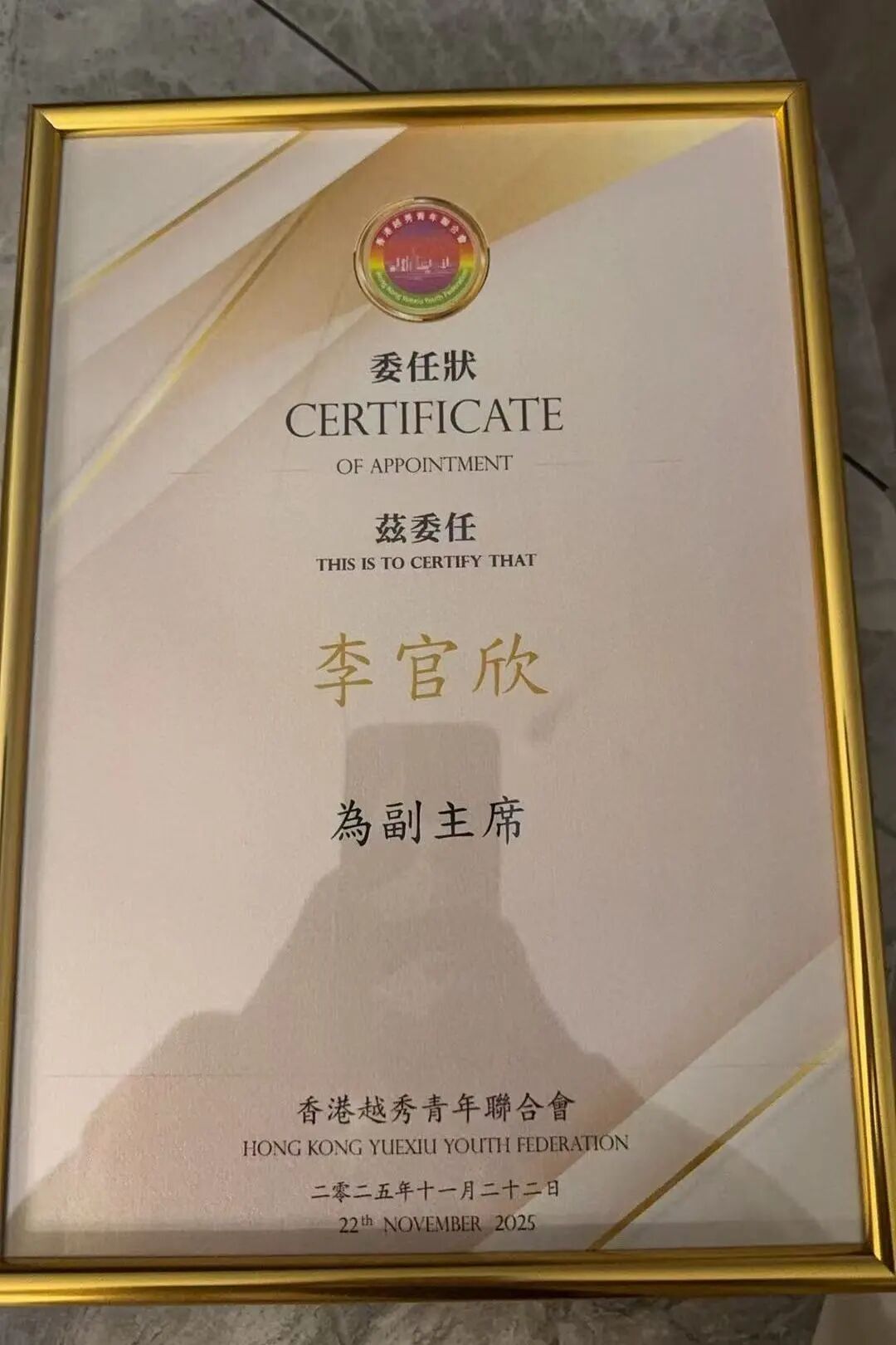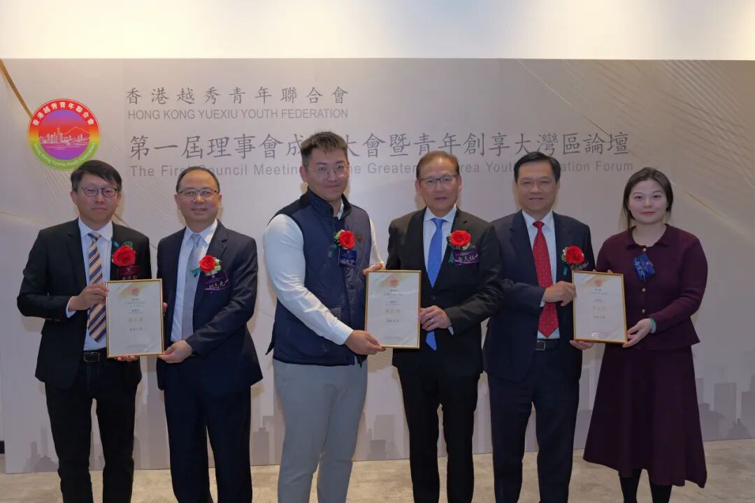 成立大会上,主礼嘉宾见证首届理事会成员颁发委任证书。其中,广州市越秀区侨界青年联合会副会长、广东诺臣律师事务所(以下简称“诺臣所”)高级合伙人李官欣律师获聘为首届香港越秀青年联合会副主席。