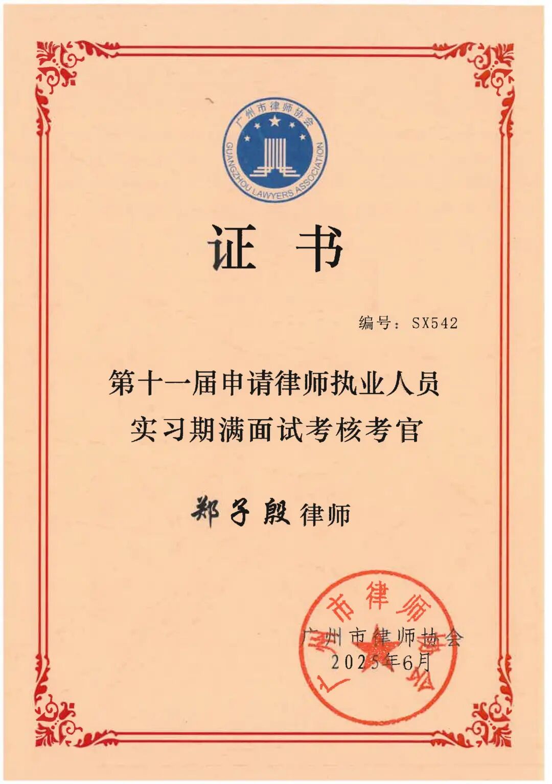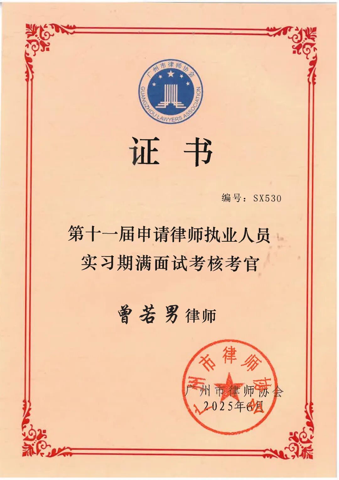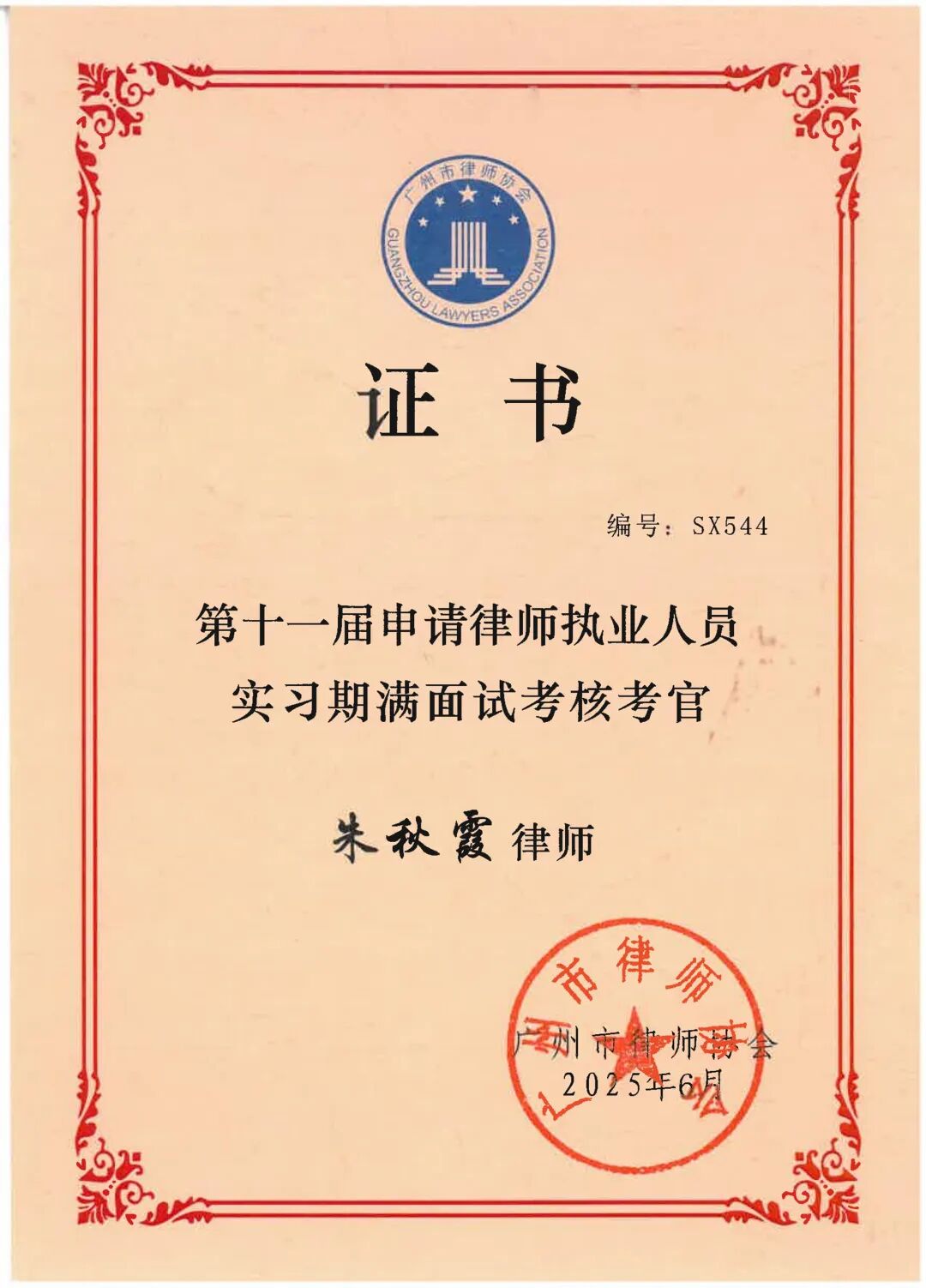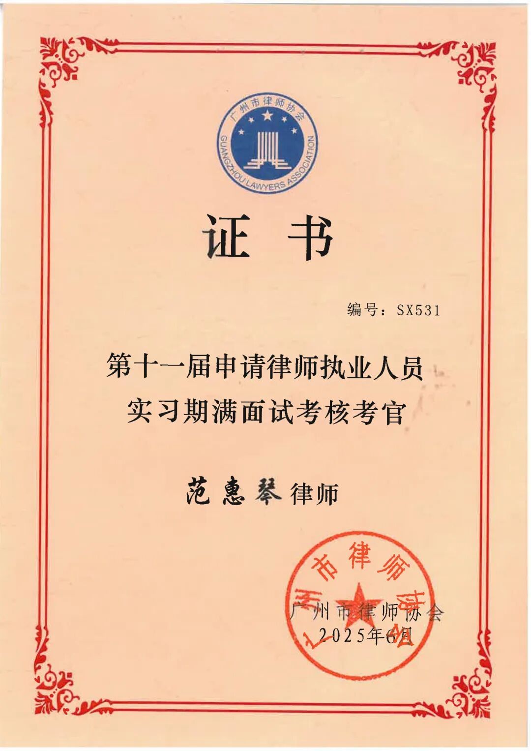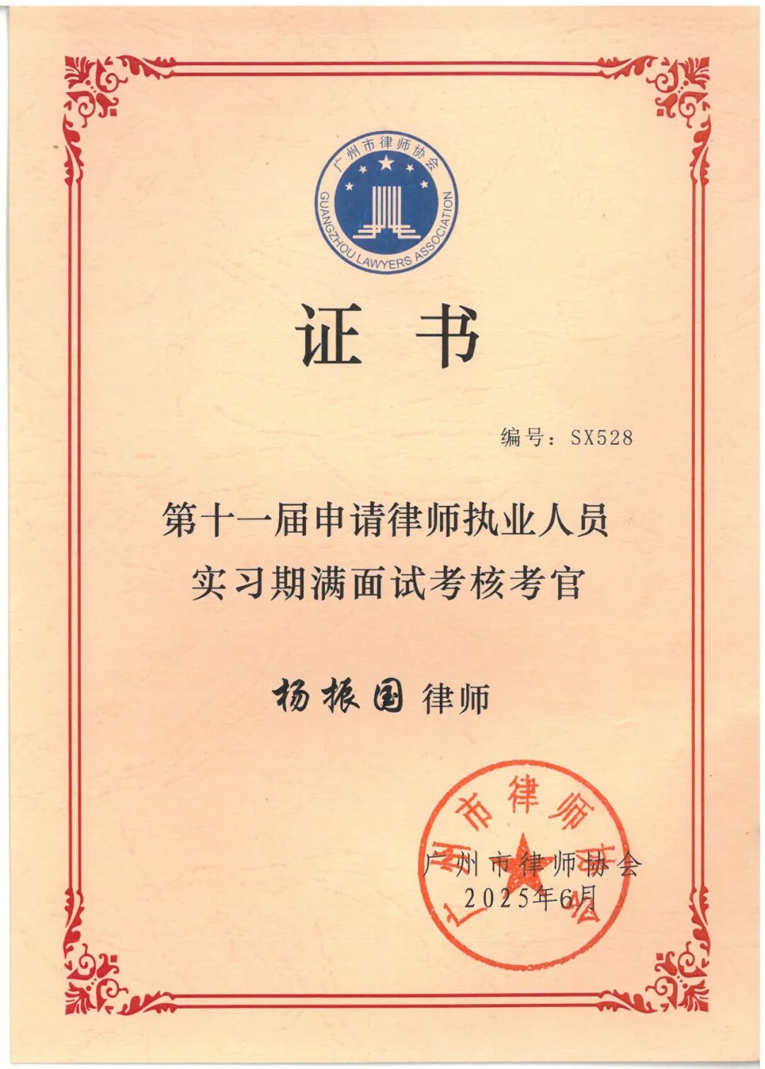 实习阶段是青年律师成长成才的关键时期,也是律师执业准入的关键环节,事关律师队伍整体素质和法治人才队伍建设水平。获聘为申请律师执业人员实习期满面试考核考官,既是本所律师个人专业能力的充分认可,也是律所整体实力与行业贡献度的体现,同时鼓励着我们在未来更加注重对实习人员的系统化培养与职业道德熏陶,共同肩负起为行业选拔、输送优秀后备人才的重任,为推动广州市律师行业的高质量发展与法治建设贡献力量。