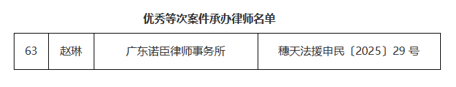办理的案件获评“优秀”等次,赵琳律师表示,这既是荣誉更是鞭策,未来将继续秉持“人民律师为人民”的理念,深耕法律援助一线,以更扎实的专业功底、更贴心的服务举措,为受援人撑起法治晴空。诺臣所也将以此次表彰为契机,进一步强化社会责任担当,鼓励更多律师投身法律援助事业,不断提升服务质量,为推进法治广州建设、维护社会和谐稳定贡献坚实力量。