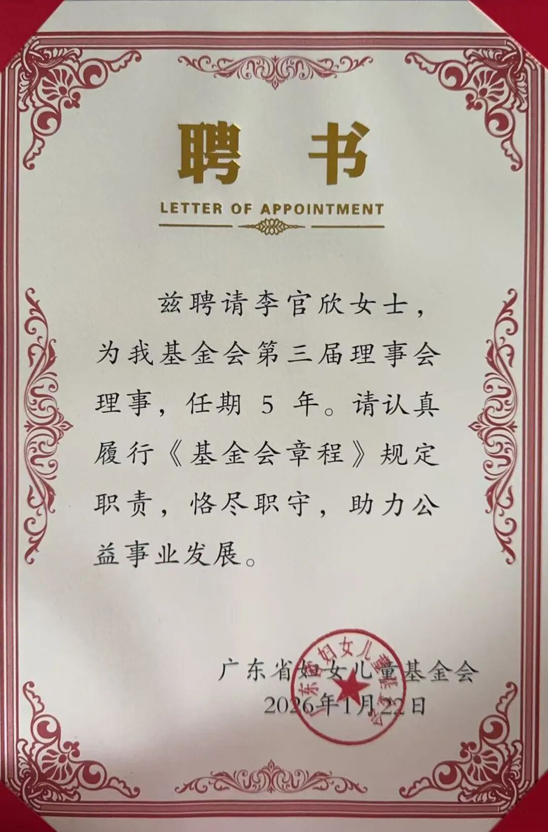 李官欣律师深耕法律领域多年,兼具深厚专业素养与强烈社会责任感。作为新一届理事会理事,李律师将积极以法律专业能力为基金会工作赋能,助力妇女儿童权益保障工作走深走实。相信在第三届理事会带领下,基金会将以全新面貌深耕公益领域,切实为广大妇女儿童办实事、解难题,传递公益温暖,续写妇女儿童公益事业高质量发展新篇章。
