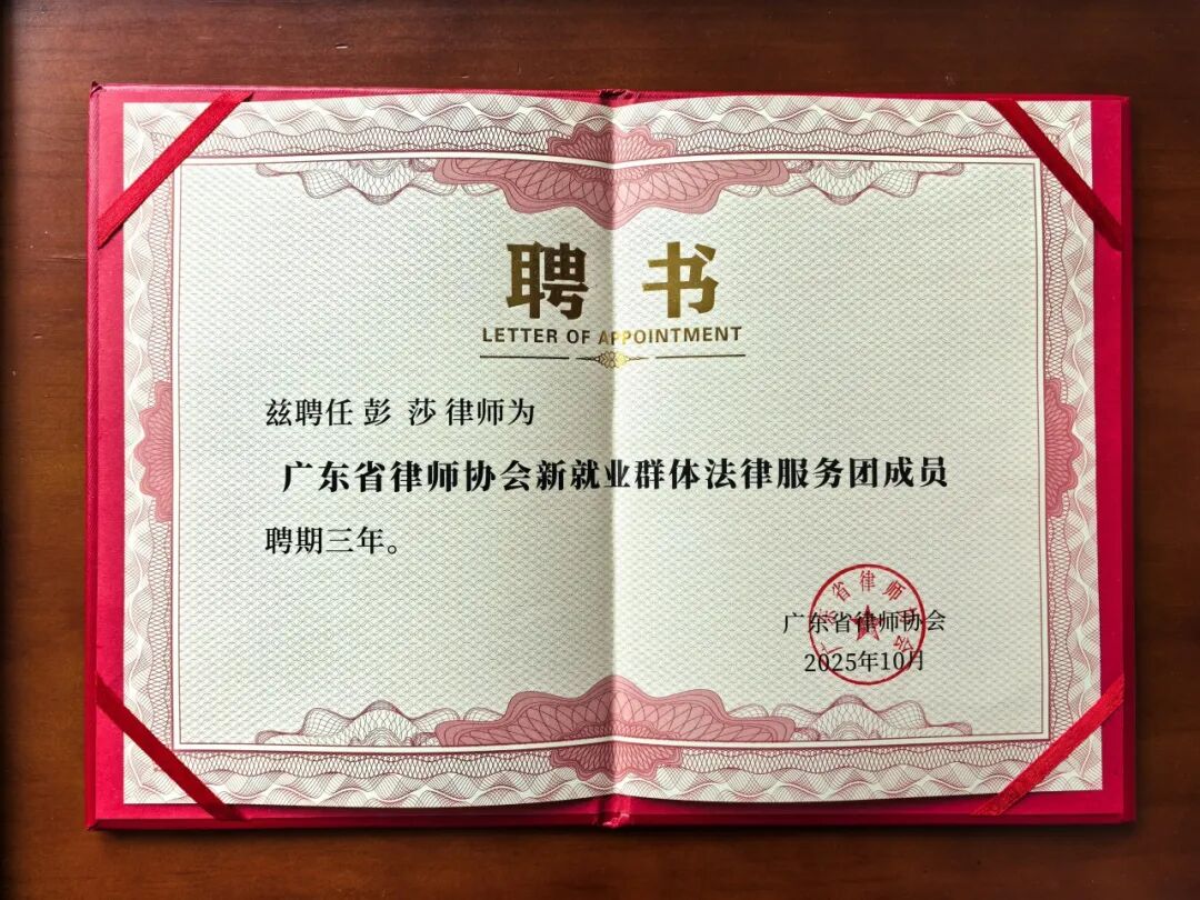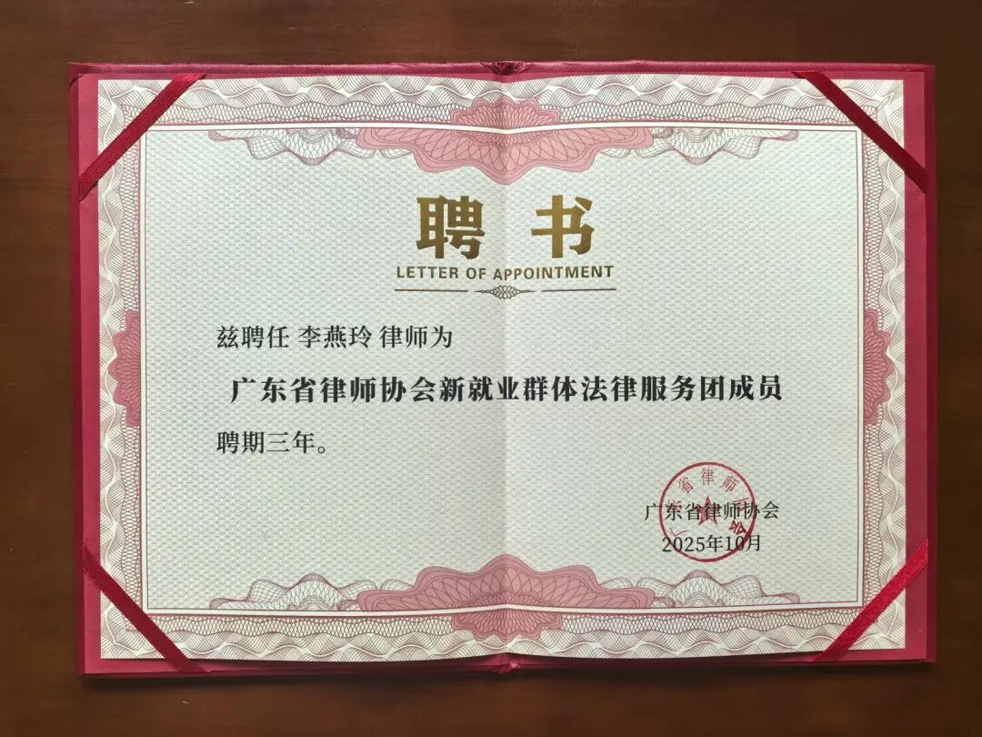 日前,在广东省委社会工作部、省司法厅等部门的指导下,广东省律师协会组建成立了由肖胜方会长担任团长的新就业群体法律服务团。这支专业法律队伍,聚焦新就业群体法律难题,以精准对接、专业响应的姿态为新就业群体提供 “权益护盾”。经选拔,广东诺臣律师事务所合伙人、女律师工作委员会主任李燕玲律师及副主任彭莎律师荣幸获聘为法律服务团成员。