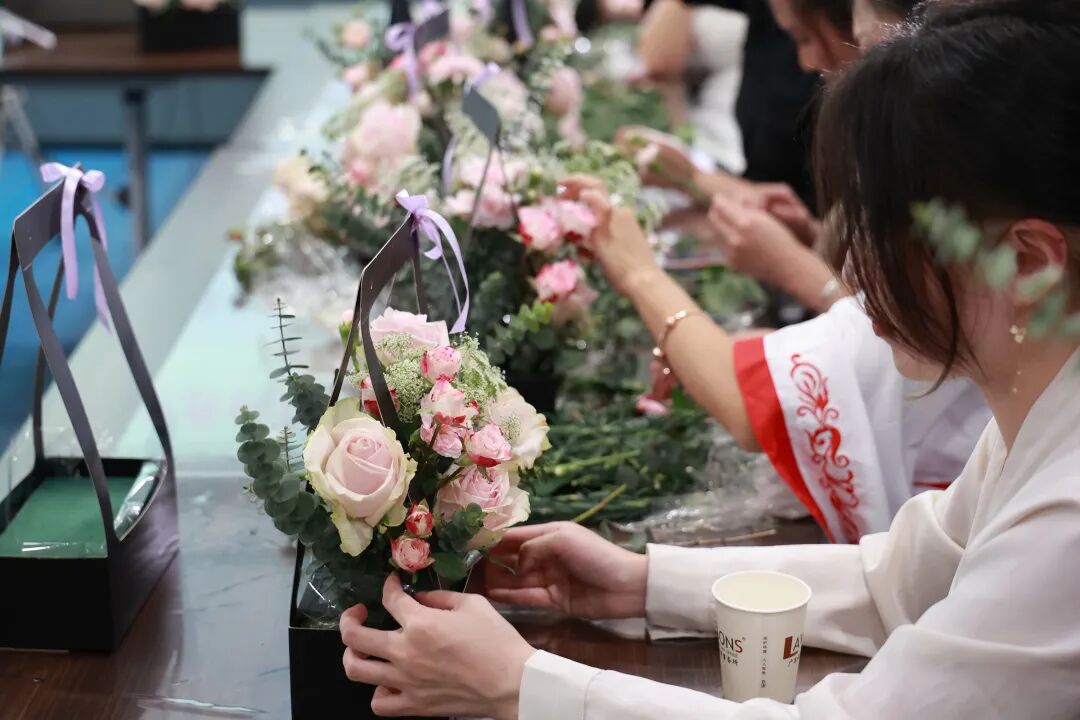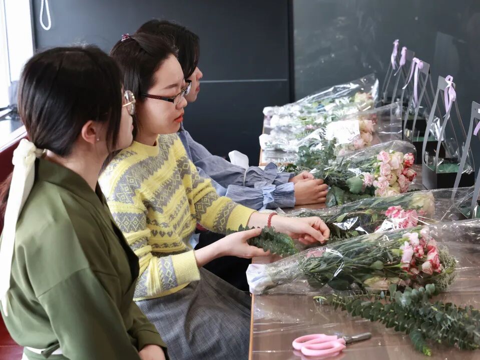 大家用灵巧的双手,编织出一个个色彩鲜艳,创意十足的花艺作品,一朵朵鲜花错落有致地拼插,一个个精致的花篮逐渐成形。