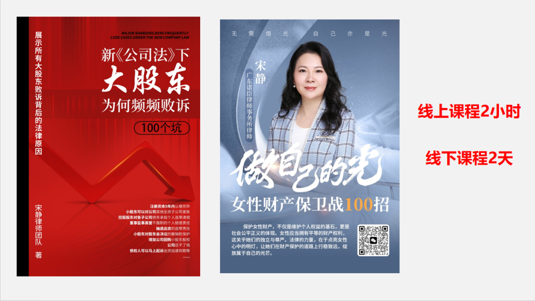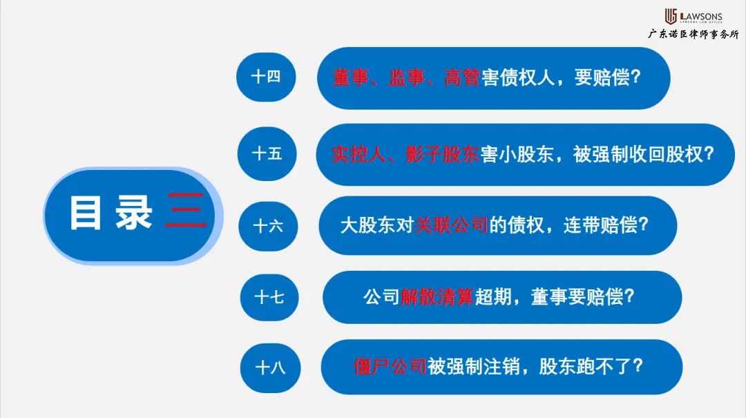 接下来,宋静律师为大家讲解本期课程要点:公司股东、董事、监事、高级管理人员需要面对的五大责任与风险,即董监高侵害债权人的赔偿责任、实控人侵害小股东权益时的回购救济、大股东对关联公司债权的连带赔偿责任、公司解散清算超期时董事的赔偿责任、强制注销情形下股东的连带责任。