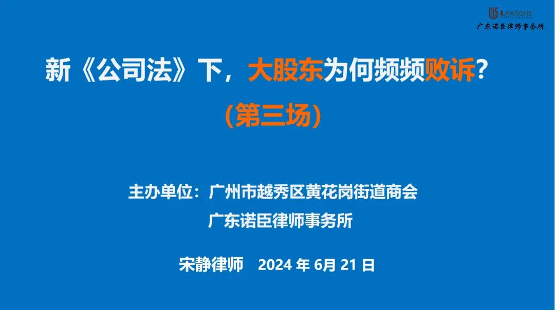 2024年6月21日,广东诺臣律师事务所(以下简称“诺臣所”)宋静律师受黄花岗街道商会邀请,作为黄花岗街道商会“新《公司法》下大股东为何频频败诉”主题系列课程的主讲律师,为商会企业家讲解新《公司法》对大股东、企业家的风险点,并解答企业家们关于新《公司法》施行后实缴制度、股权转让等新规落地实操问题的疑惑。