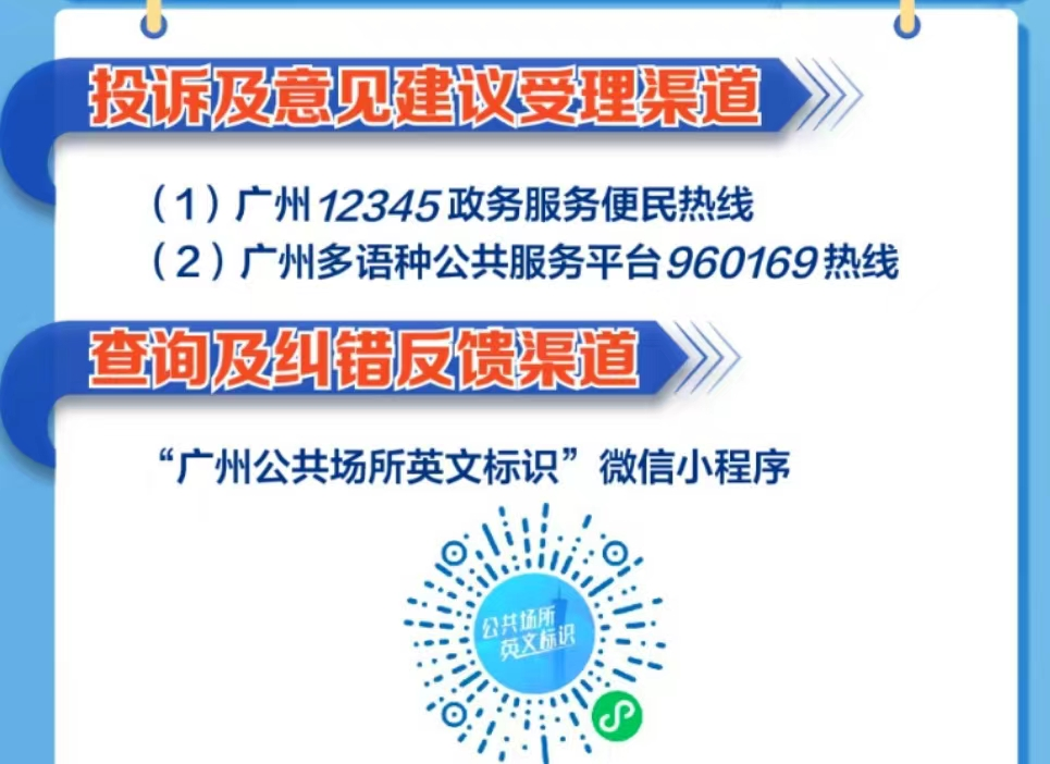 另外,《规定》还明确了公众监督的渠道。除了政府热线12345,以及相关政府部门门户网站以及其他政务服务平台等常规的投诉、举报渠道之外,《规定》第四条第一款规定了可以“通过广州市多语种公共服务服务平台受理、处理对违反本规定行为的投诉举报或者意见建议。”“广州多语种公共服务平台”(960169热线)由市政府外办于2019年设立,为市民和外籍人士提供免费城市公共信息查询和公共事务翻译服务,为在穗机构、企业及对外窗口部门提供翻译支撑。市民朋友们拨打960169,可以对违反《规定》的行为进行举报投诉以及反馈意见建议,也可以通过微信小程序进行纠错。