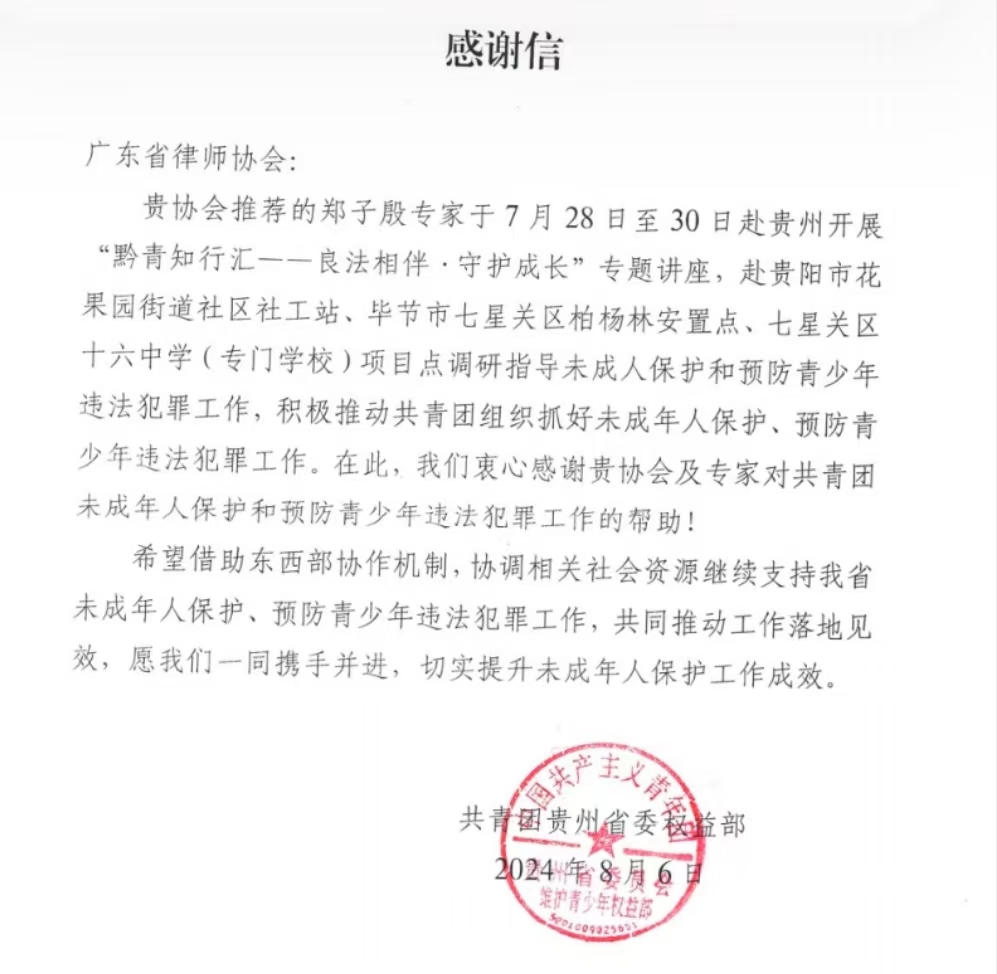 在贵州之行以后,贵州省共青团委权益部向我所郑子殷律师发来感谢信,其表示郑律师此行积极推动了该地抓好未成年人保护,预防青少年违法犯罪工作 ,并表达了衷心的感谢。