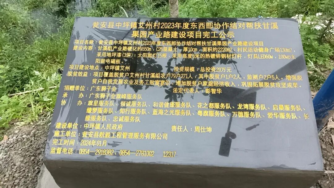 为响应百千万工程,助力乡村振兴,增强当地脱贫户自我发展农业及务工致富意识,增加脱贫户家庭经济收入,巩固拓展脱贫攻坚成果,2023年郑子殷律师感召广东狮子会为瓮安县中坪镇艾州村修建甘溪组果园产业路,项目覆盖:艾州村甘溪组农户79户271人,其中脱贫户1户2人,监测户2户5人。覆盖果园面积1230余亩,合计资助金额20万元。
