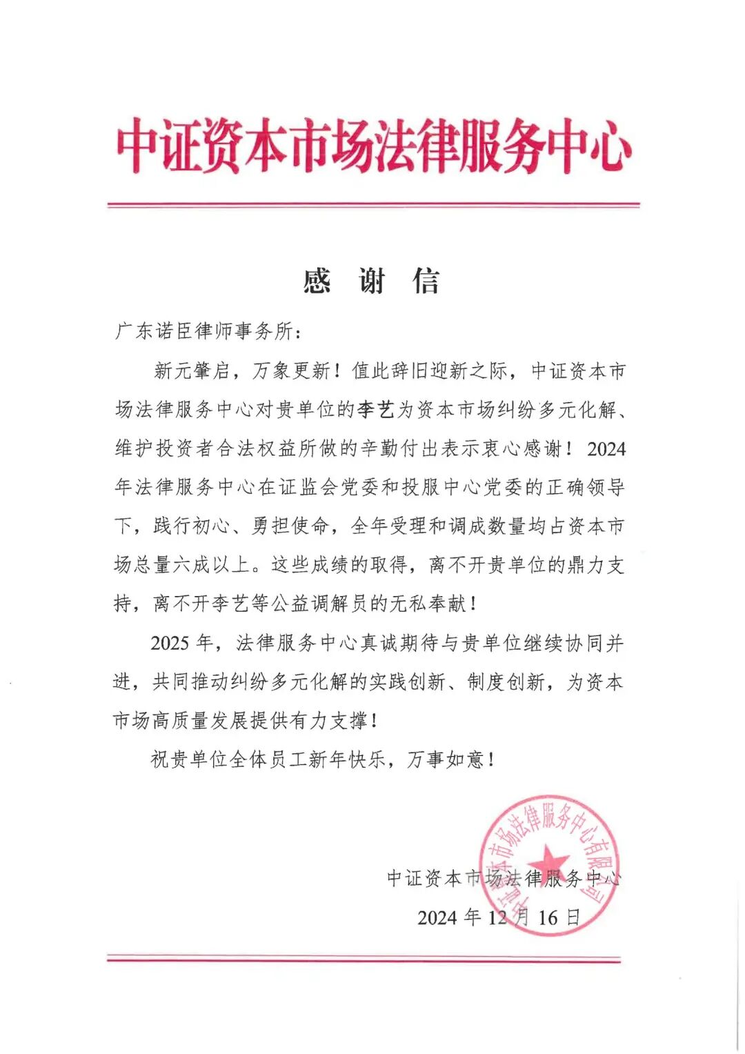 近日,广东诺臣律师事务所(以下简称“诺臣所”)收到来自中证资本市场法律服务中心的《感谢信》。信中对诺臣所及担任中证资本市场法律服务中心公益调解员的一级合伙人李艺律师表示感谢。