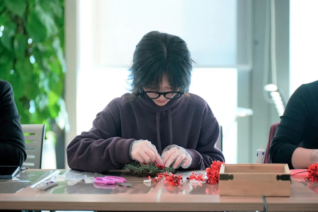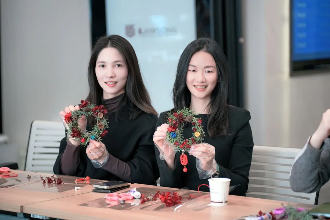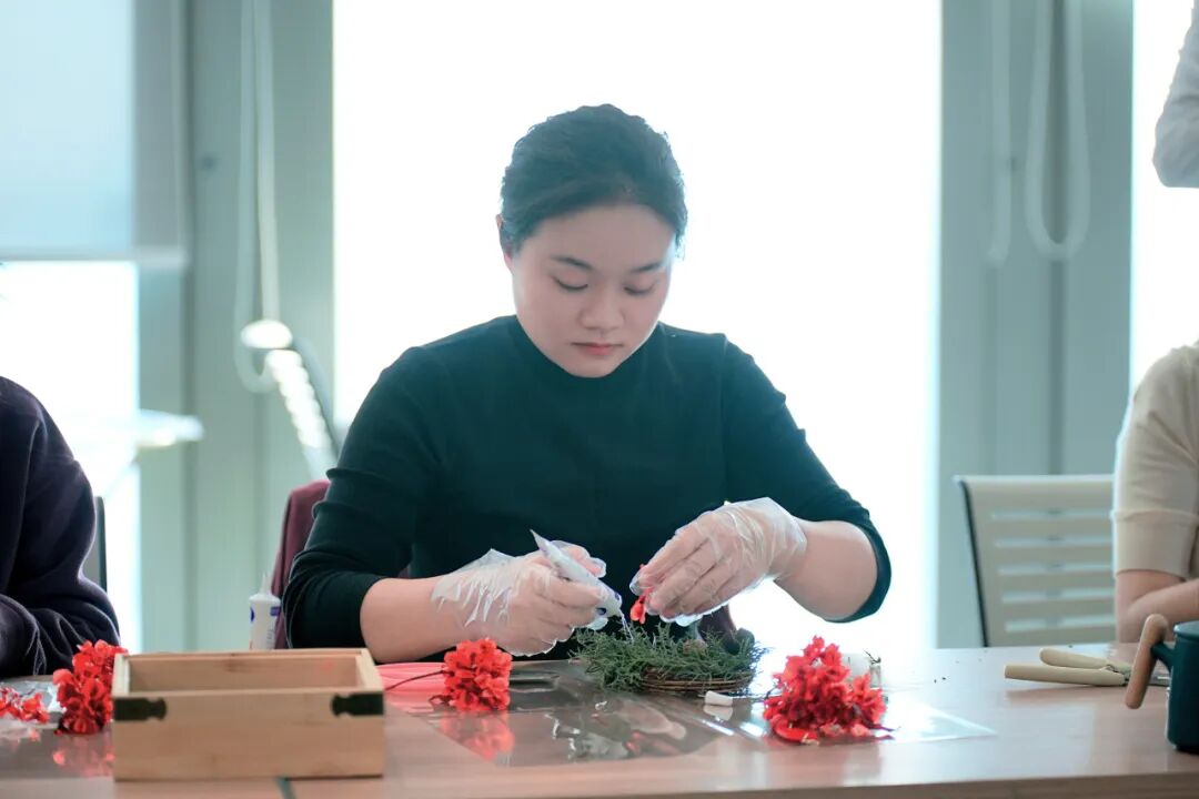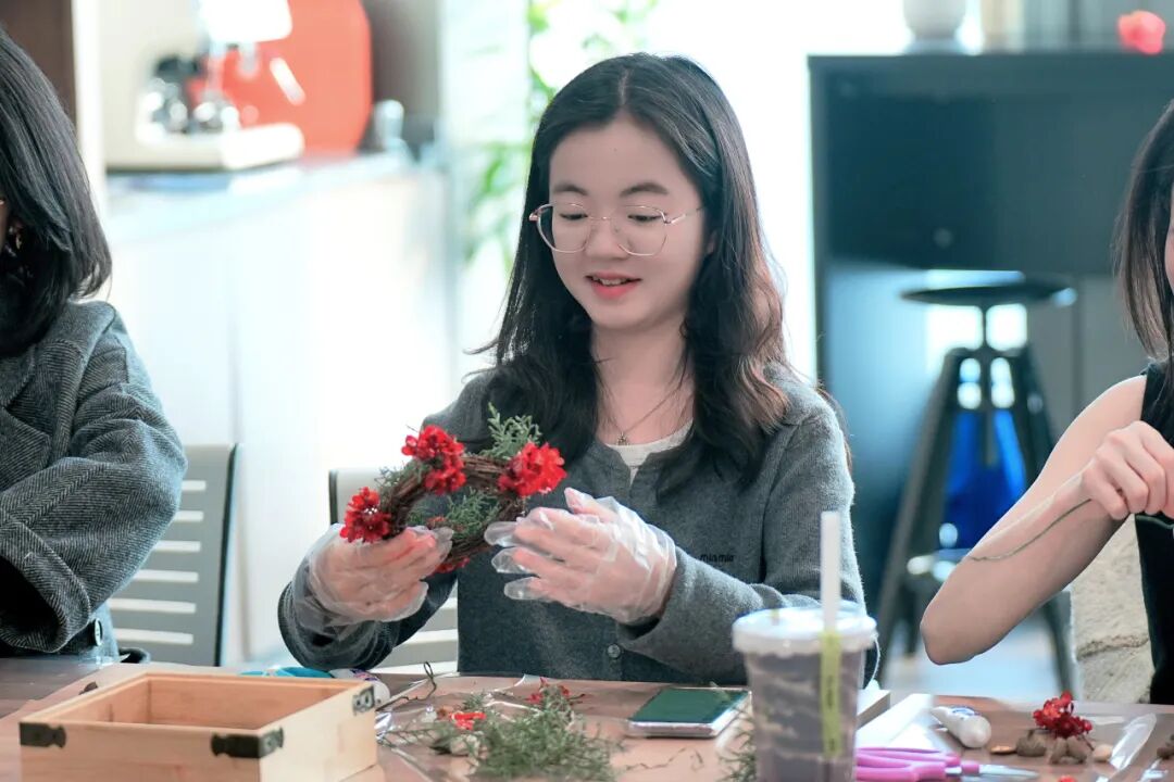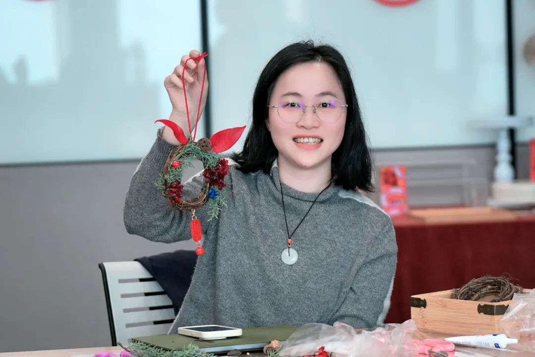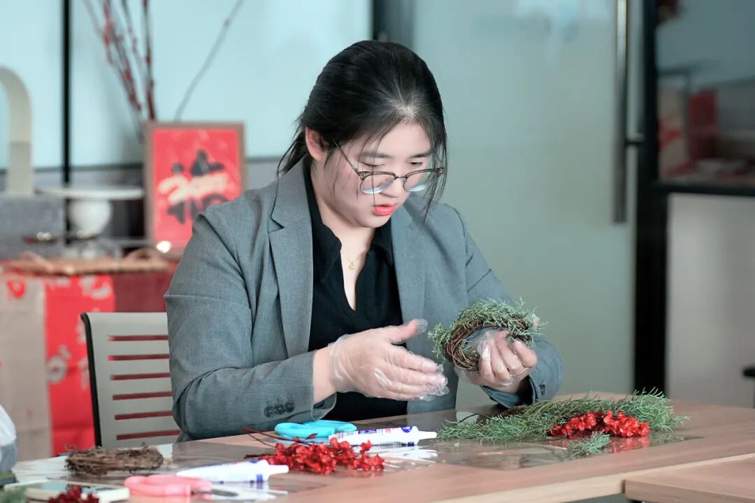 在制作过程中,大家互相帮助,互相学习,现场氛围热烈而温馨,大家都沉浸在手工制作的乐趣之中。经过一个小时的努力,一个个精美的元旦花环终于诞生了。花环一直是一种古老的文化表达,象征着幸福、圆满。这些花环不仅代表着他们的劳动成果,更承载着对新年的美好祝愿和期待。
