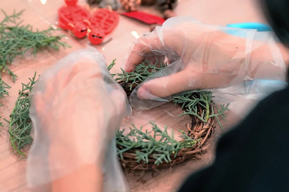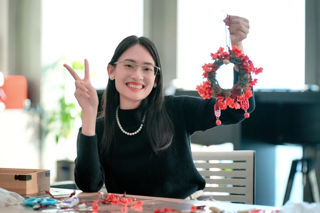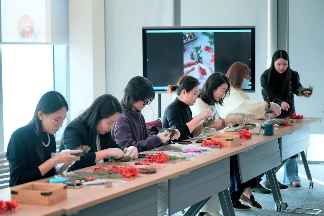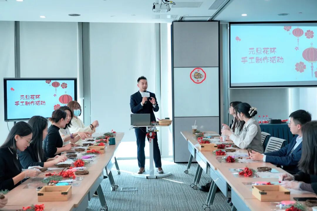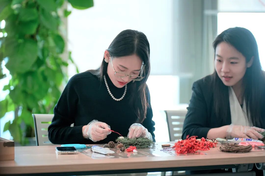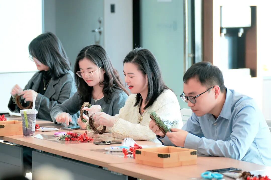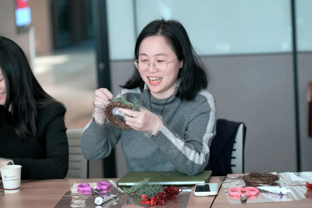 在元旦花环手工制作活动中,各位参与的同事展现了极高的热情和创造力。诺臣所为大家准备了各种各样的手工材料和装饰物,藤条圈、丝带、手工胶、小饰品等应有尽有,令人目不暇接,活动邀请的资深花艺老师,则为大家详细讲解并现场演示花环的制作方法。