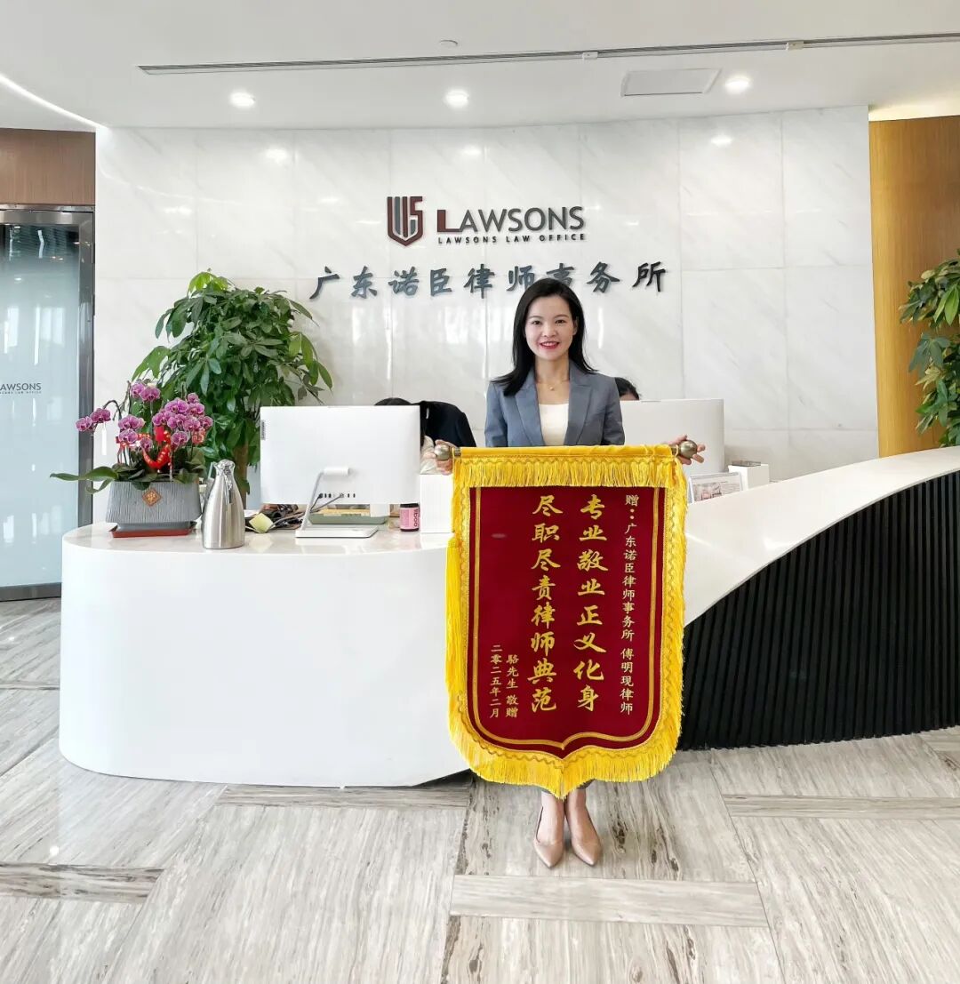 2025年2月27日,广东诺臣律师事务所合伙人傅明现律师收到了当事人骆先生赠送的锦旗。锦旗上“专业敬业,正义化身,尽职尽责,律师典范”,这不仅是对傅律师专业能力的高度认可,也是对其服务态度的真诚赞扬,更是对其成功解决客户法律问题的有力见证。