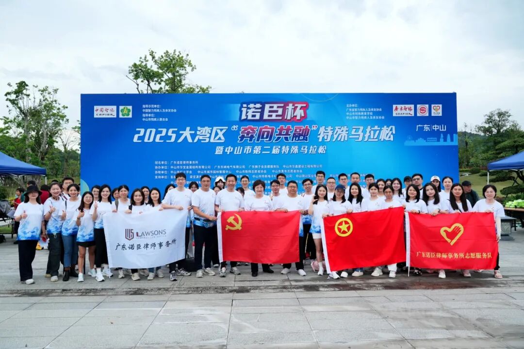 2025年5月9日,由广东诺臣律师事务所(以下简称“诺臣所”)独家冠名的诺臣杯-2025大湾区“奔向共融”特殊马拉松在中山市金钟湖公园圆满落幕。本次活动吸引了来自粤港澳大湾区的近千名智力障碍人士、亲友、志愿者及社会爱心人士参与,诺臣所选派50余名志愿者深度参与其中,10 名专业伴跑志愿者以 “两两牵手” 的方式全程陪伴特殊群体运动员完成 10 公里挑战,其余志愿者则在各赛道承担路线指引、加油助威等工作,用耐心与热情守护每一个奔跑的身影。