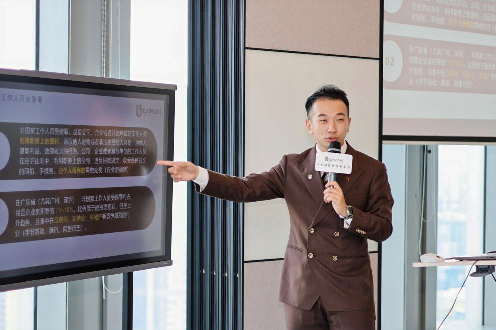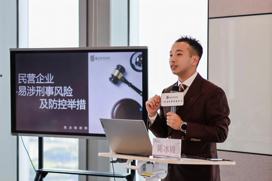 陈冰锦律师则以《民营企业易涉刑事风险及防控举措》为主题,结合多年实务经验,深入剖析了企业经营管理中常见的高危刑事风险点。从虚开增值税专用发票罪、非国家工作人员受贿罪等高发罪名切入,陈律师以案释法,层层递进,为企业主敲响风险防范的警钟。他特别强调:刑事风险是企业发展的“隐形地雷”,事前合规的成本远低于事后补救的代价。现场听众频频记录要点,更有企业家在讲座后直言:“这些看似遥远的问题,原来就藏在日常决策的细节里。”
