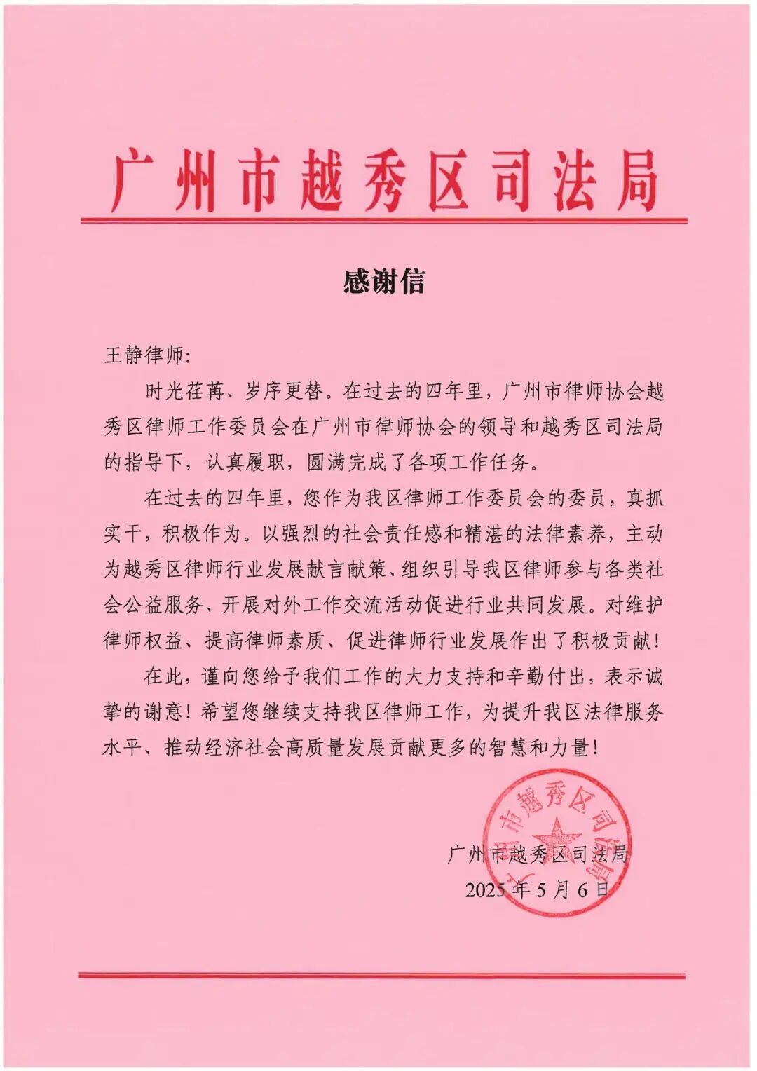 近日,广州市越秀区司法局向广东诺臣律师事务所(以下简称“诺臣所”)管委会常务副主任、高级合伙人王静律师发来感谢信,对王静律师的工作给予高度评价和衷心感谢。