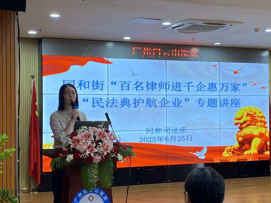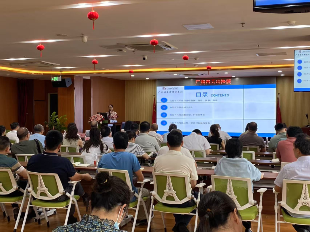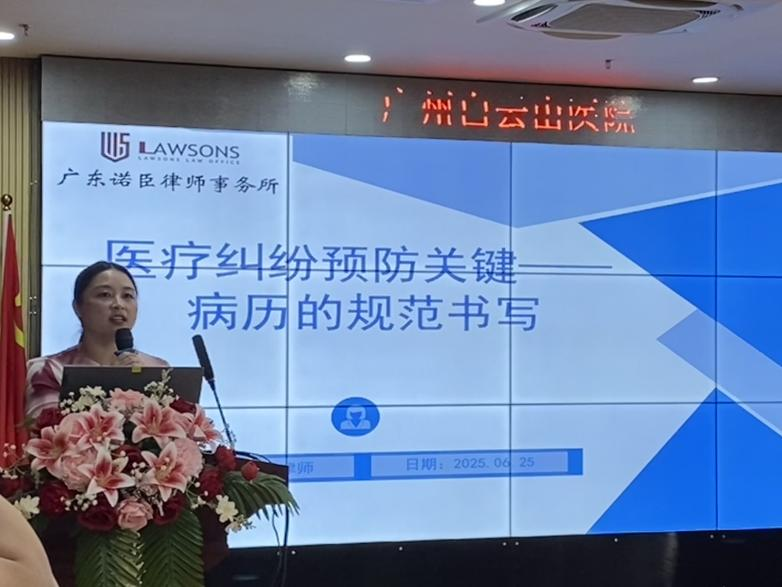 为推广医疗合规制度、降低医疗纠纷法律风险,2025年6月25日,广东诺臣律师事务所合伙人刘芳律师应广州市司法局同和司法所邀请,赴广州白云山医院开展“医疗纠纷预防关键——病历的规范书写”法律知识讲座,本次讲座属于广州市白云区同和街“百名律师进千企惠万家”“民法典护航企业”专题系列讲座之一。同和司法所所长及广州白云山医院一众领导均出席了讲座,广州白云山医院近80名医务人员参与了本次讲座,现场气氛热烈,讲座成效显著。