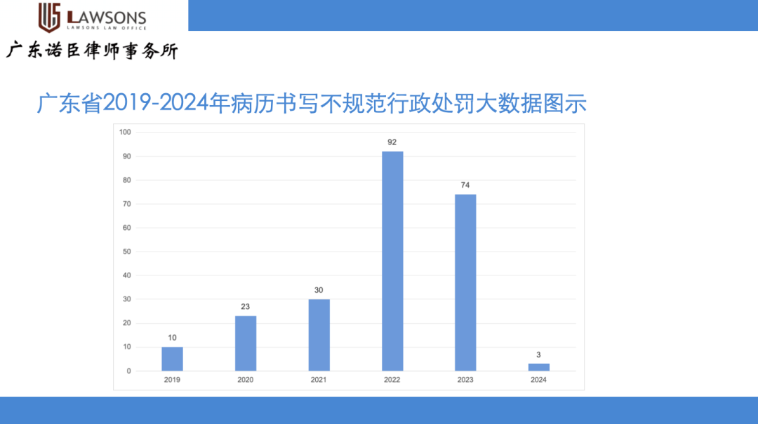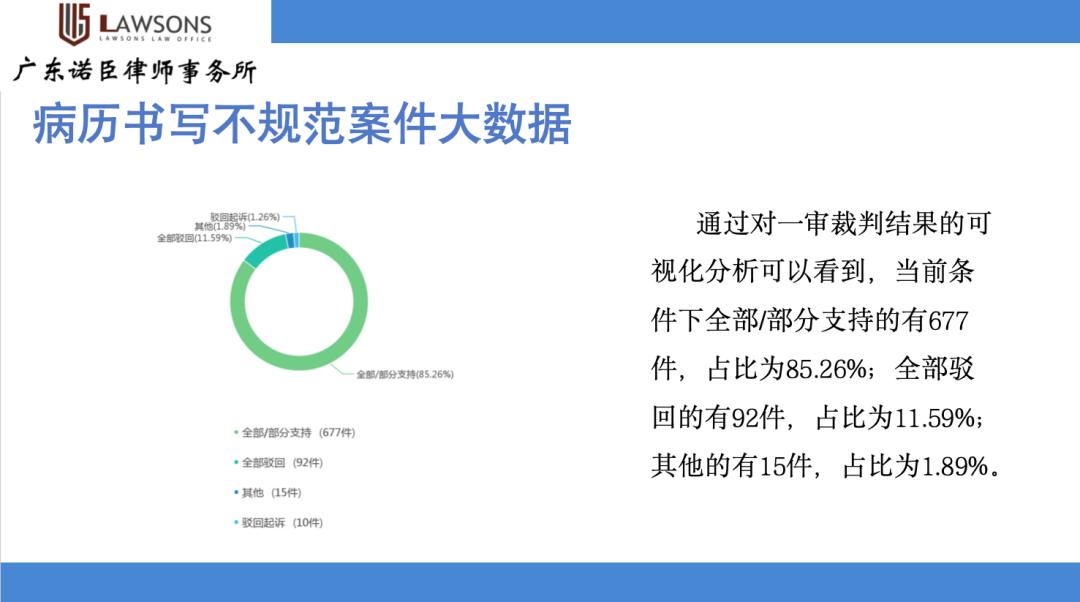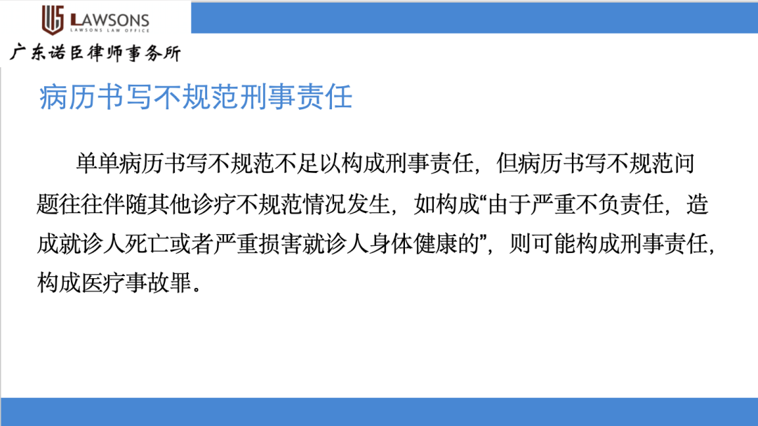 刘芳律师深耕于医疗大健康法律领域多年,具备丰富的医疗纠纷处理经验。刘芳律师首先点明病历书写不规范所涉及的法律责任,结合实际案例和大数据检索深入浅出地分析了医疗领域的行政责任、民事责任和刑事责任。