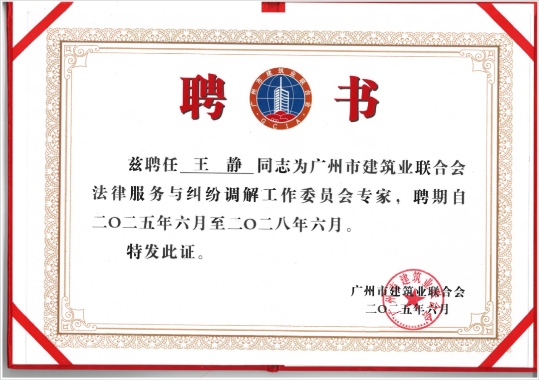 近日,广东诺臣律师事务所高级合伙人、管委会常务副主任兼行政总监王静律师获聘广州市建筑业联合会法律服务与纠纷调解工作委员会专家,聘期自2025年6月至2028年6月。