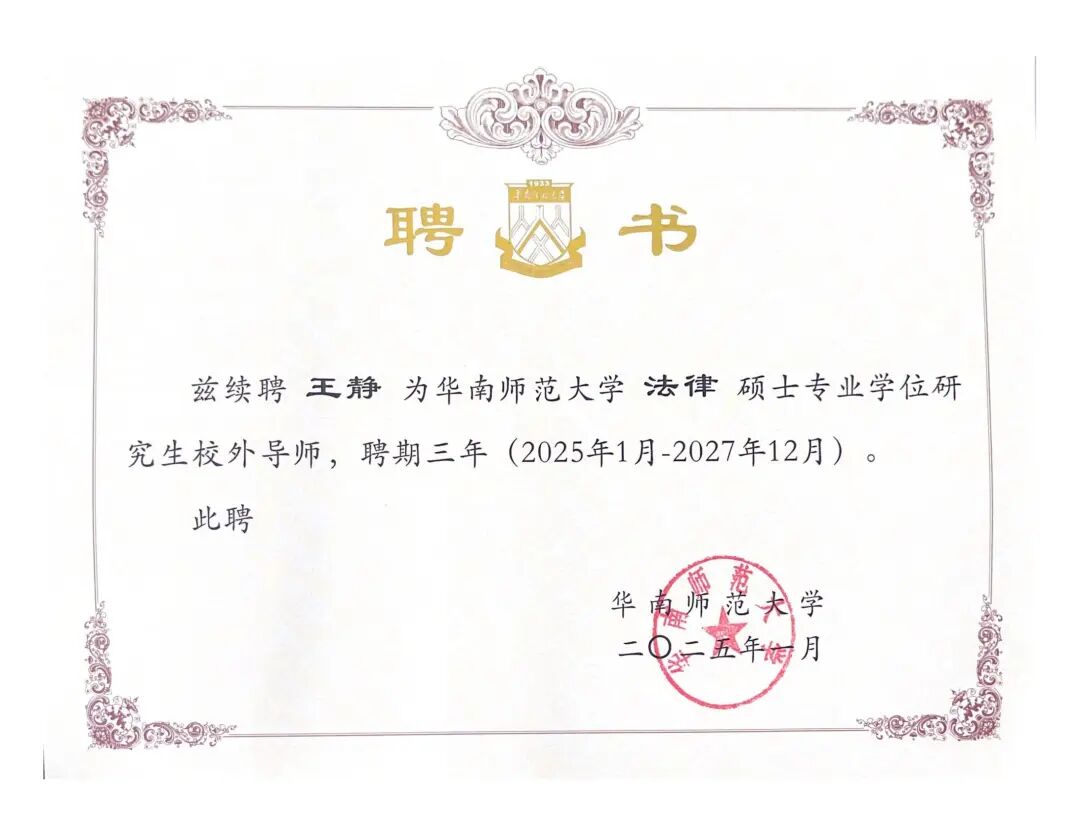近日,华南师范大学向广东诺臣律师事务所高级合伙人、管委会常务副主任兼行政总监王静律师正式颁发了法律硕士专业学位研究生校外导师续聘聘书。