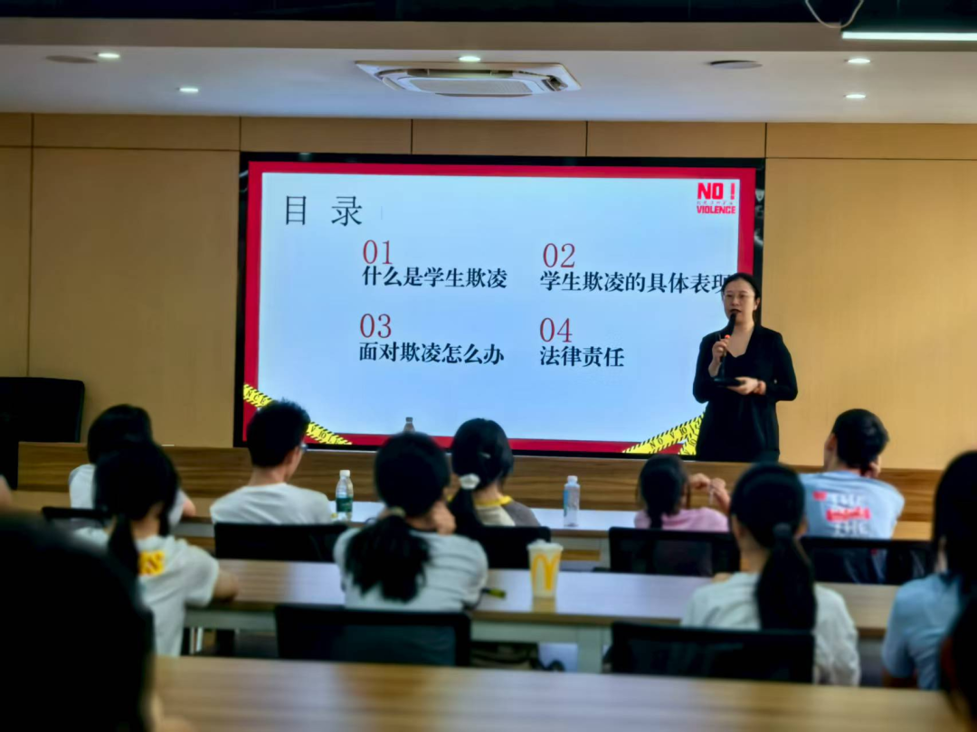 活动第一部分,黎嘉敏律师带来了主题为“学生自我保护 预防学生欺凌”的普法专题讲座。她通过PPT用生动活泼的语言向同学们讲解了学生欺凌的表现形式、危害后果以及应对方法。黎律师特别强调:“遇到欺凌时,沉默不是金,要及时向老师、家长或相关部门反映。”