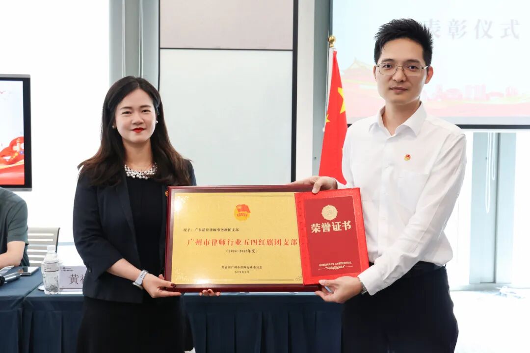 以荣誉激励奋进,以榜样引领担当。黄福轩委员对诺臣所团支部颁发“广州市律师行业五四红旗团组织”奖牌和证书。