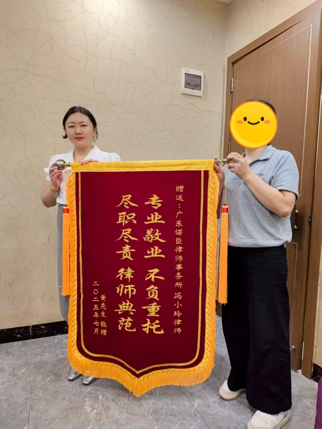 2025年7月21日,一起掩饰隐瞒犯罪所得罪案件的当事人家属向广东诺臣律师事务所合伙人冯小玲律师赠送锦旗,以示感谢。