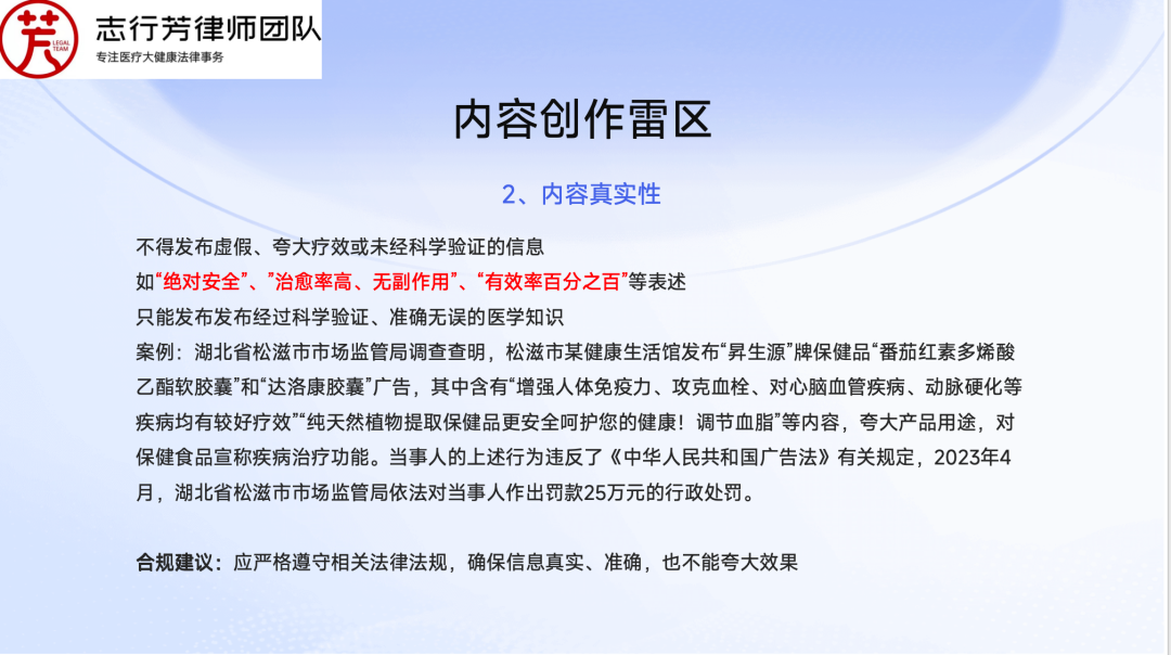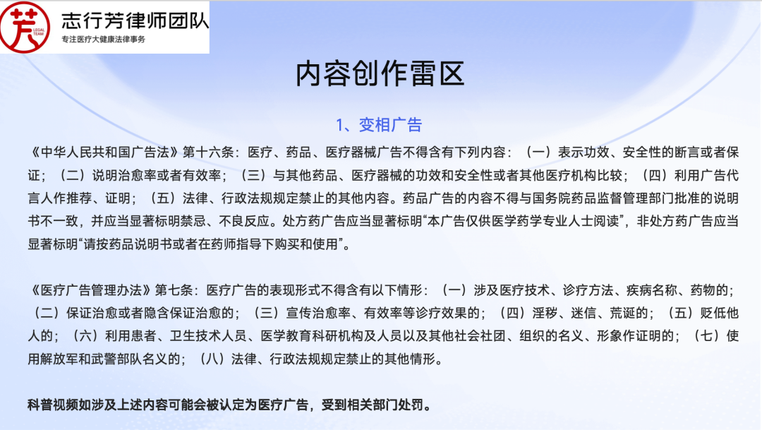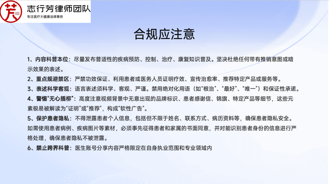 近期,国家卫生健康委召开新闻发布会,国家卫生健康委新闻发言人、宣传司副司长胡强强提醒注意“网红医生”把医疗科普当作牟利工具。讲座中刘芳律师紧密结合国家最新监管动态,重点解读了国家卫健委宣布将加大互联网健康科普乱象整治力度的政策背景。刘芳律师还详细介绍了四川、上海、黑龙江等地出台的《互联网健康科普负面行为清单》等文件的核心要求,强调了各地对于互联网健康科普内容的具体规范。刘芳律师对医生科普给出了专业建议,警示科普内容需坚守真实、科学、客观原则,不得变相广告、夸大疗效、泄露患者隐私等行为。