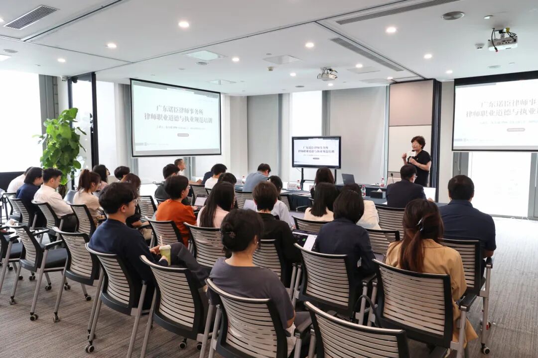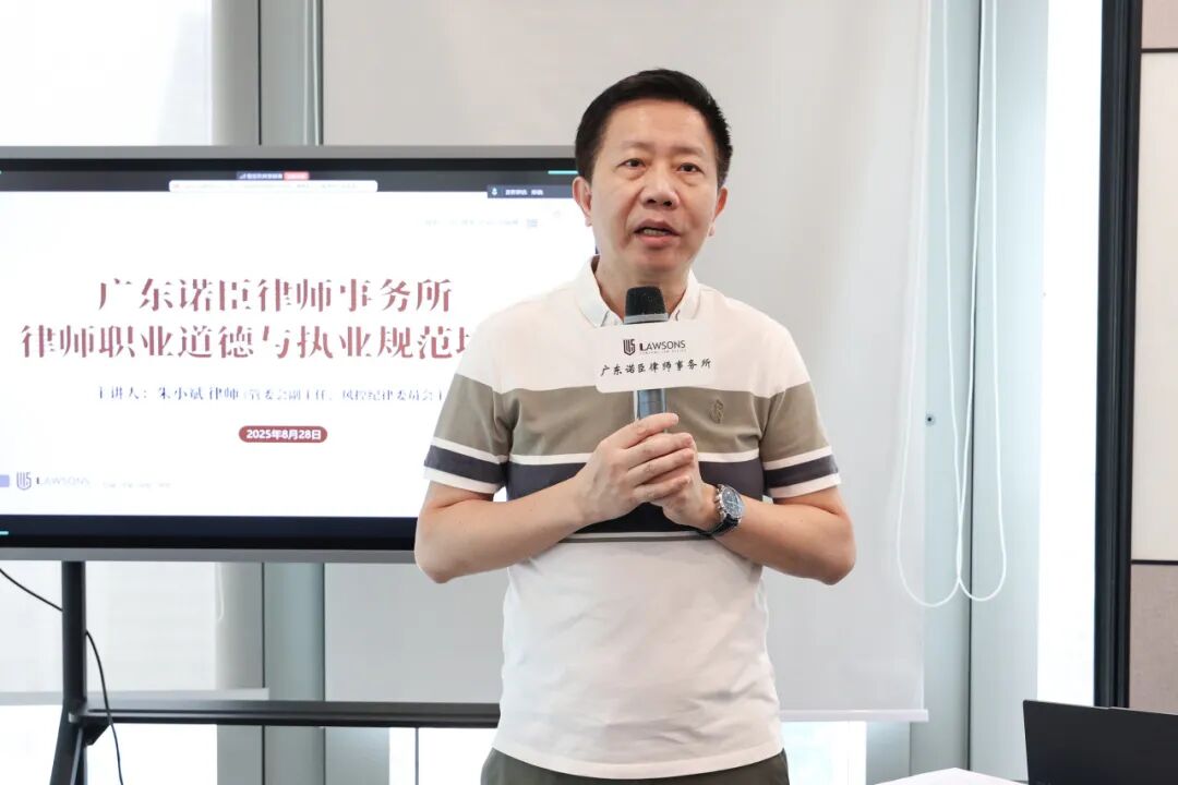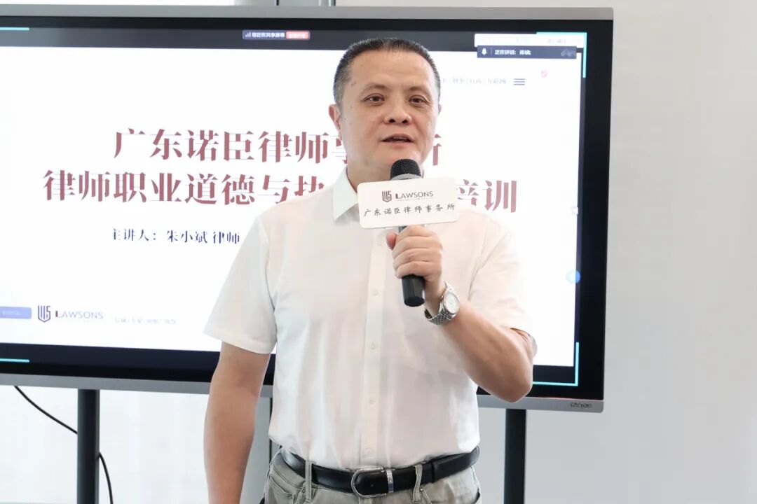 为加强本所律师队伍的职业素养、规范执业行为,有效防范执业风险,保障本所业务的稳健开展,8月28日下午,广东诺臣律师事务所(以下简称“诺臣所”)在大会议室开展了律师职业道德与执业规范培训。诺臣所党总支书记、管委会主任官选斌律师,合伙人会议主席官选芸律师,监事会主席雷建威律师,管委会常务副主任、行政总监王静律师,管委会常务副主任、财务总监曾祥敏律师,管委会副主任、风控纪律委员会主任朱小斌律师,管委会副主任车天驰律师等出席本次培训,律所全体律师及实习人员以线上线下双模式积极参加培训。本次培训由朱小斌律师担任主持及主讲人。