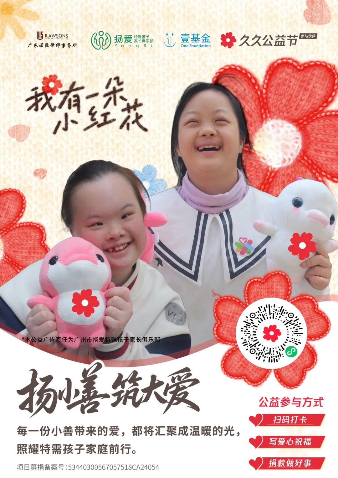 公益不分大小,爱心无关多少。倡议大家根据自身情况进行捐款,善款将直接用于“扬善筑爱助阿甘圆梦”项目,支持心智障碍人士的康复训练、技能培养等工作。