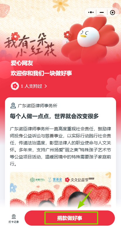 诺臣所一直高度重视社会责任,鼓励律师投身公益,以实际行动践行社会责任,传递法治温度,彰显法律人的职业使命与人文关怀。诺臣所希望通过此次行动,让每一位参与者都能以举手之劳践行社会责任。诺同心,善同行,诚挚邀请大家与诺臣所“益”起来,共圆“阿甘”梦想,让公益的力量照亮特殊孩子家庭前行的路!
