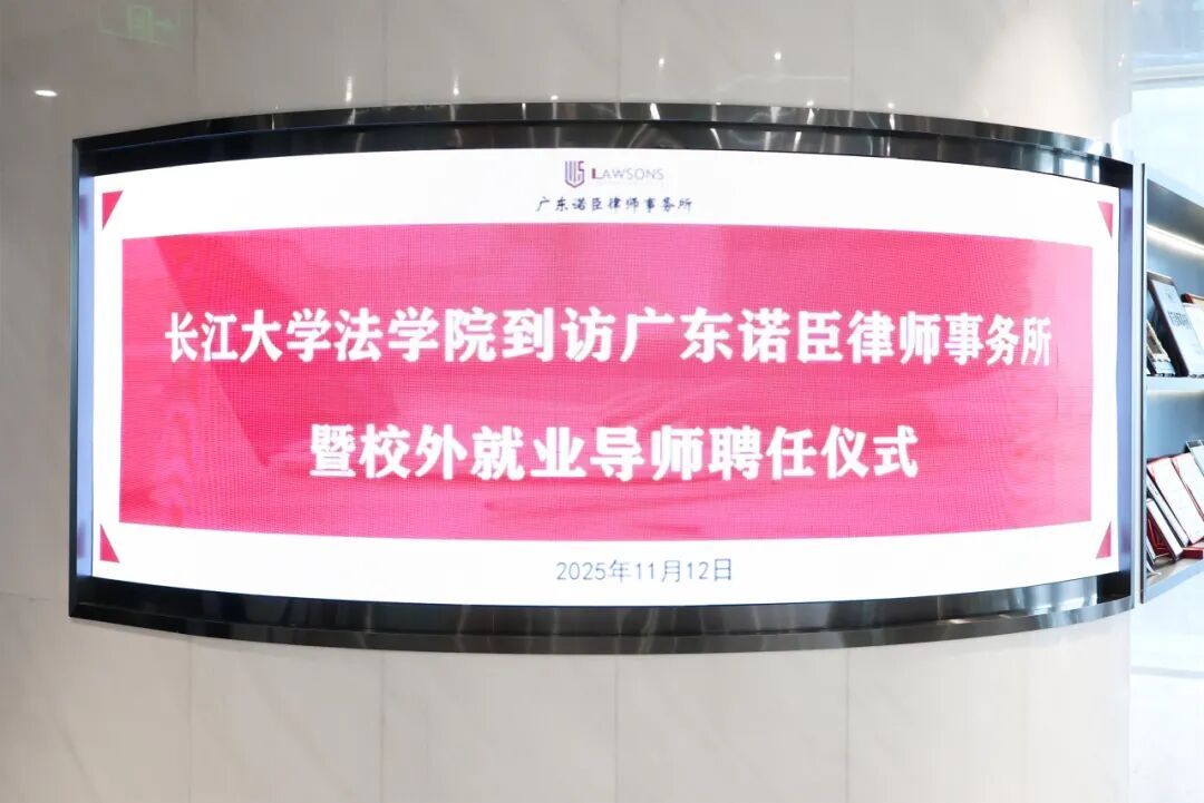 2025年11月12日上午,长江大学法学院党委书记张凡、院长李华成及长江大学法学院众校友一行到访广东诺臣律师事务所(以下简称“诺臣所”),双方共同举行校外就业导师聘任仪式。诺臣所党总支书记、管委会主任官选斌律师,管委会常务副主任曾祥敏律师,管委会副主任朱小斌律师,监事会副主席石伟民律师,一级合伙人、长江大学法学院优秀校友刘芳律师出席仪式,青年律师代表刘志怡律师任仪式主持。