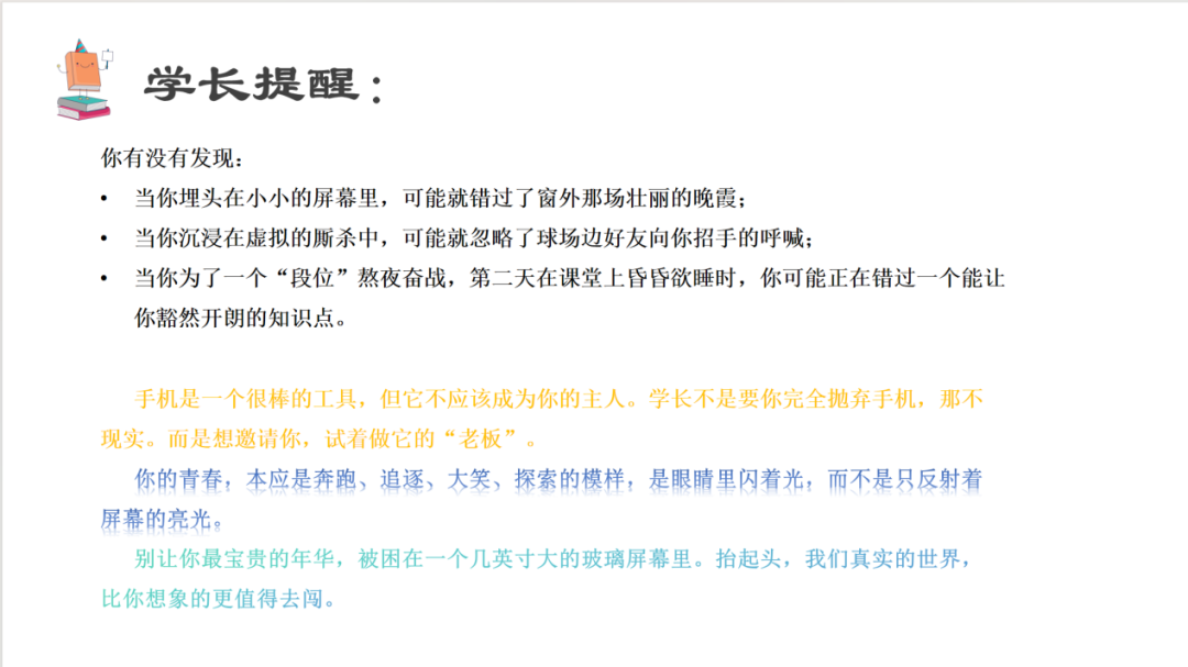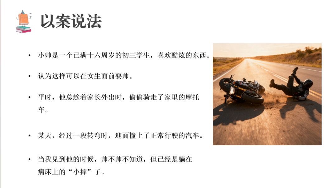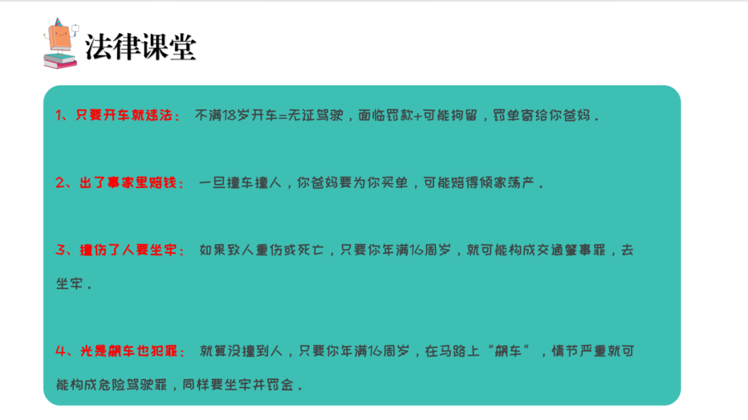 随后,讲座围绕“马路不是赛车场”“手机不是全世界”“拳头不是话语权”三大板块展开,结合真实案例,生动剖析了交通安全、网络沉迷、校园欺凌等青少年常见法律风险。