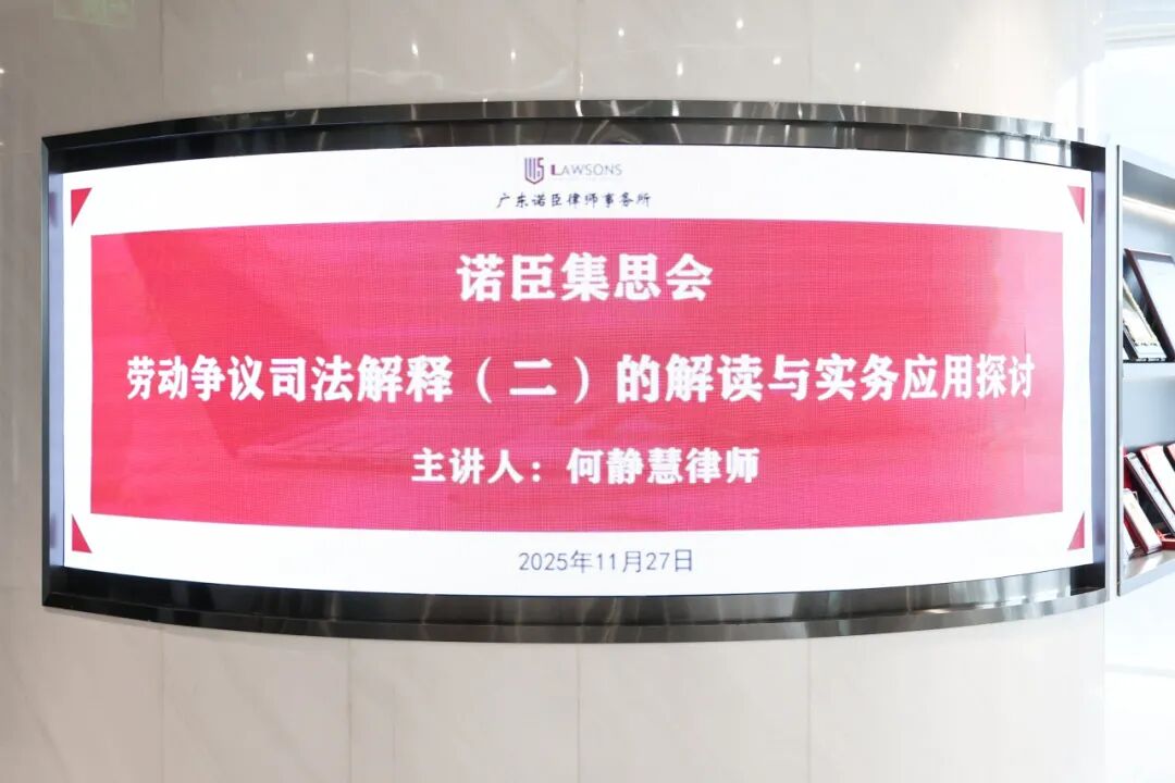 11月27日下午,广东诺臣律师事务所(以下简称“诺臣所”)本期集思会顺利举办。本次集思会由诺臣所合伙人何静慧律师担任主讲人,围绕“劳动争议司法解释(二)的解读与实务应用探讨”主题进行分享。诺臣所监事会副主席、高级合伙人胡东律师及石伟民律师,劳动法律事务部主任、一级合伙人陈润民律师,合伙人何焕仪律师出席集思会,所内众多同仁参会交流。