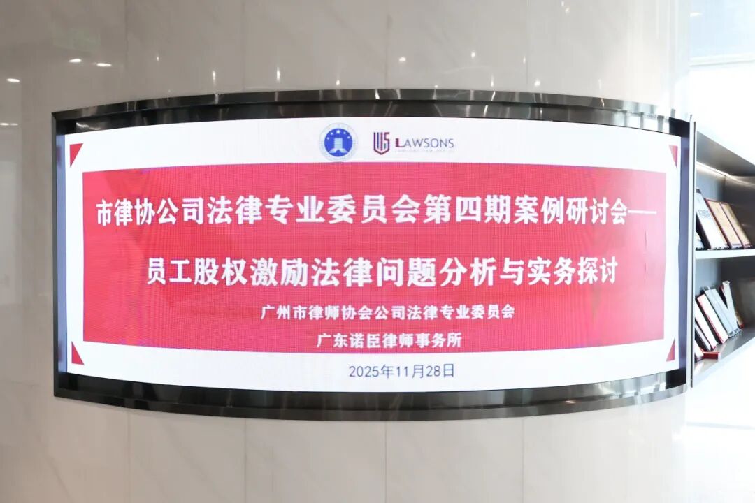 2025年11月28日下午,广东诺臣律师事务所(以下简称“诺臣所”)与广州市律师协会公司法律专业委员会成功举办第四期案例研讨会,主题为“员工股权激励法律问题分析与实务探讨”。本次研讨会聚焦股权激励领域的前沿实务问题,吸引了诸多律师同仁积极参与。研讨会由诺臣所合伙人马盼律师和广东金桥百信律师事务所刘超群律师共同主持。活动围绕股权激励的法律定性、纠纷应对及方案设计三大核心议题展开。