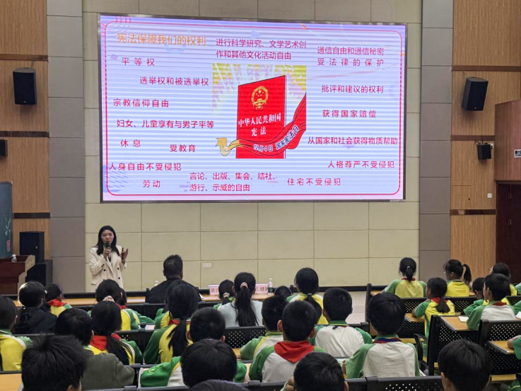 钟村中心小学的全校直播宣讲成为本次活动的亮点,孔律师通过实时互动面板回应各班级学生提问,实现普法全覆盖;其余三校则针对高年级学生特点,设计法律知识抢答环节,现场气氛热烈。“原来宪法这么贴近我们的生活”“这些保护措施让我很安心”,学生们的笔记本上记满实用知识点。