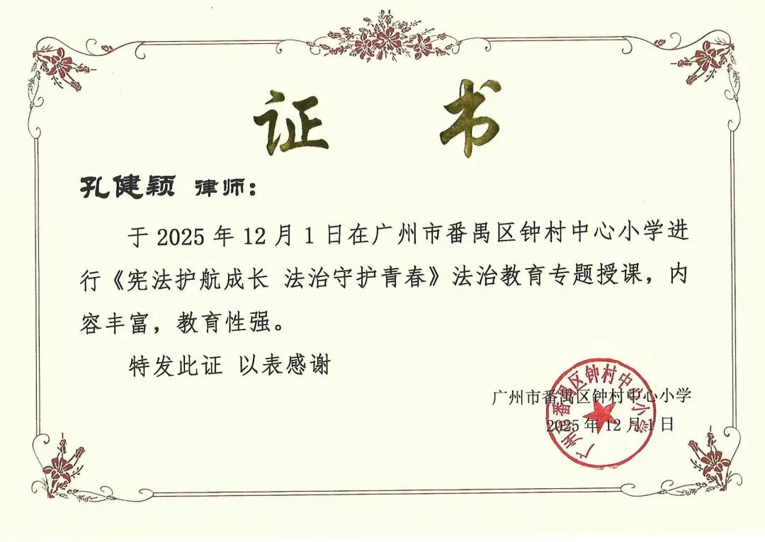 2025年国家宪法日宣传周期间,广东省未成年人保护法律专业委员会委员、广东诺臣律师事务所合伙人孔健颖律师走进广州市番禺区四所小学,开展系列宪法科普宣讲活动。孔律师鼓励同学们主动了解、学习法律知识,掌握保障自身切身权益的“武器”,其专业分享在师生中引发热烈共鸣,让法治阳光照亮青少年成长之路。