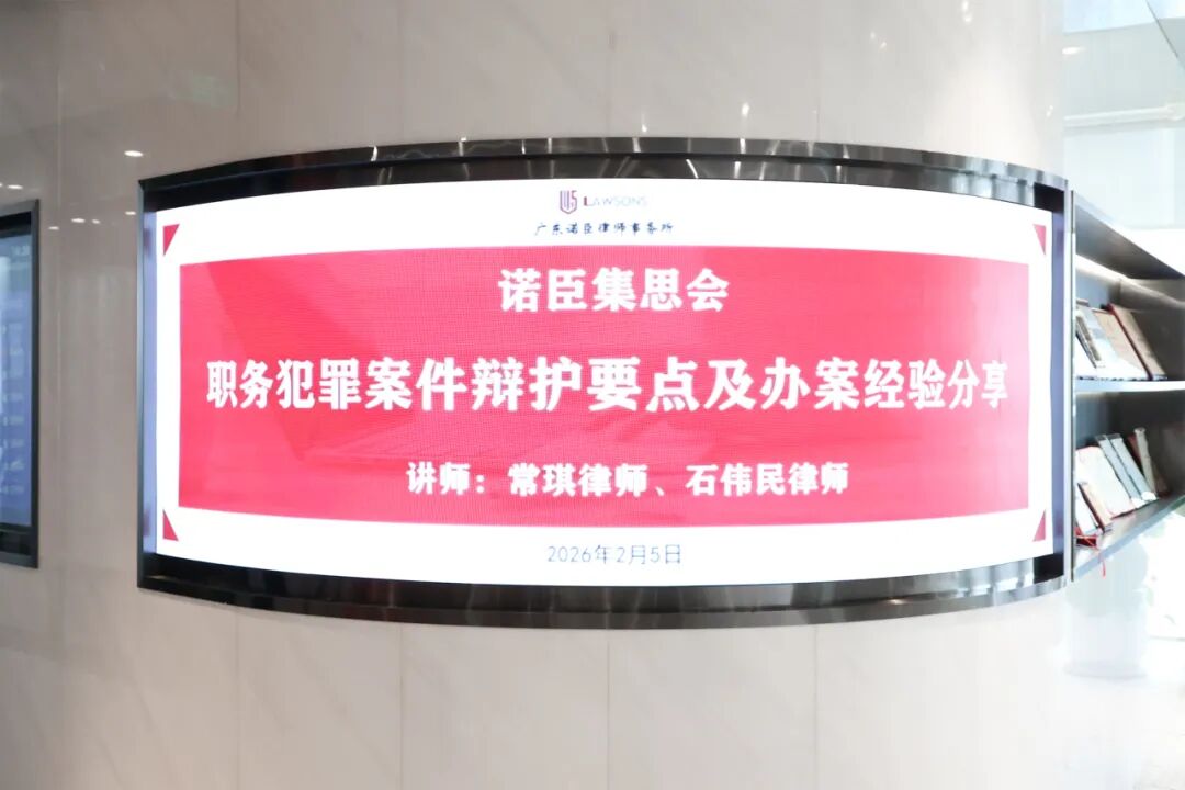 2026年2月5日下午,广东诺臣律师事务所(以下简称 “诺臣所”)如期举办专业集思会,本期集思会聚焦 “职务犯罪案件辩护要点及办案经验分享”,由高级合伙人常琪律师、石伟民律师共同主讲。诺臣所高级合伙人雷建威律师、邓大海律师,一级合伙人陈康原律师、王海森律师,合伙人何焕仪律师等出席集思会,所内律师及实习人员积极参加。
