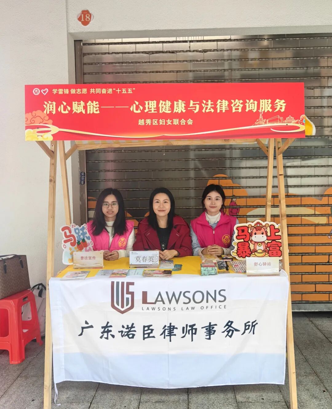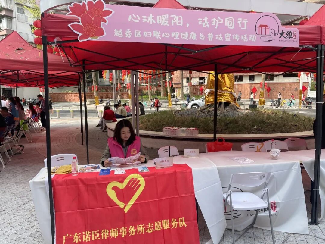 诺臣所公益委副主任、合伙人陈舒媚律师接力上阵,参与由广州市越秀区妇女联合会协办的“心沐暖阳,法护同行”主题心理健康与普法宣传活动。此次活动以志愿服务集市的形式展开,将心理健康知识与法律咨询服务有机结合,送到群众身边。