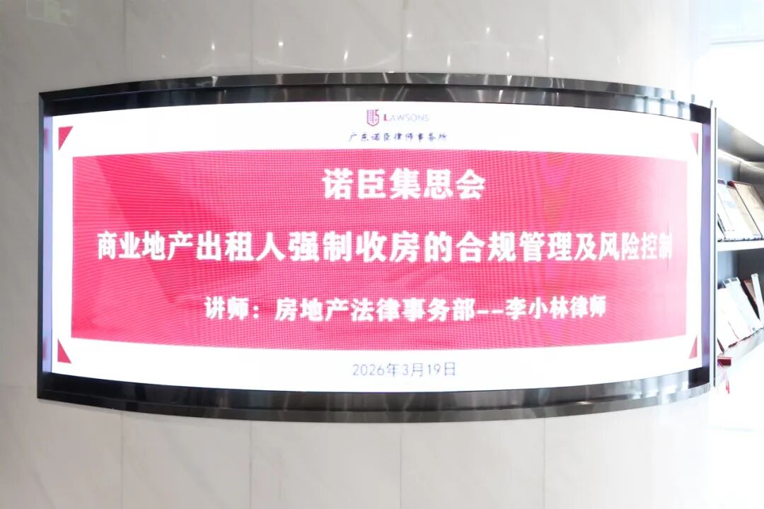 2026年3月19日下午,广东诺臣律师事务所(以下简称“诺臣所”)集思会如期举行。本期集思会由房地产法律事务部主办,由事务部副主任、高级合伙人李小林律师担任主讲,围绕商业地产出租人强制收房的合规管理及风险控制主题展开专业分享。诺臣所党总支书记、管委会主任官选斌律师,监事会副主席胡东律师,高级合伙人郑子殷律师,合伙人赵琳律师及律所众多同事齐聚现场,共同参与本次专业交流活动。
