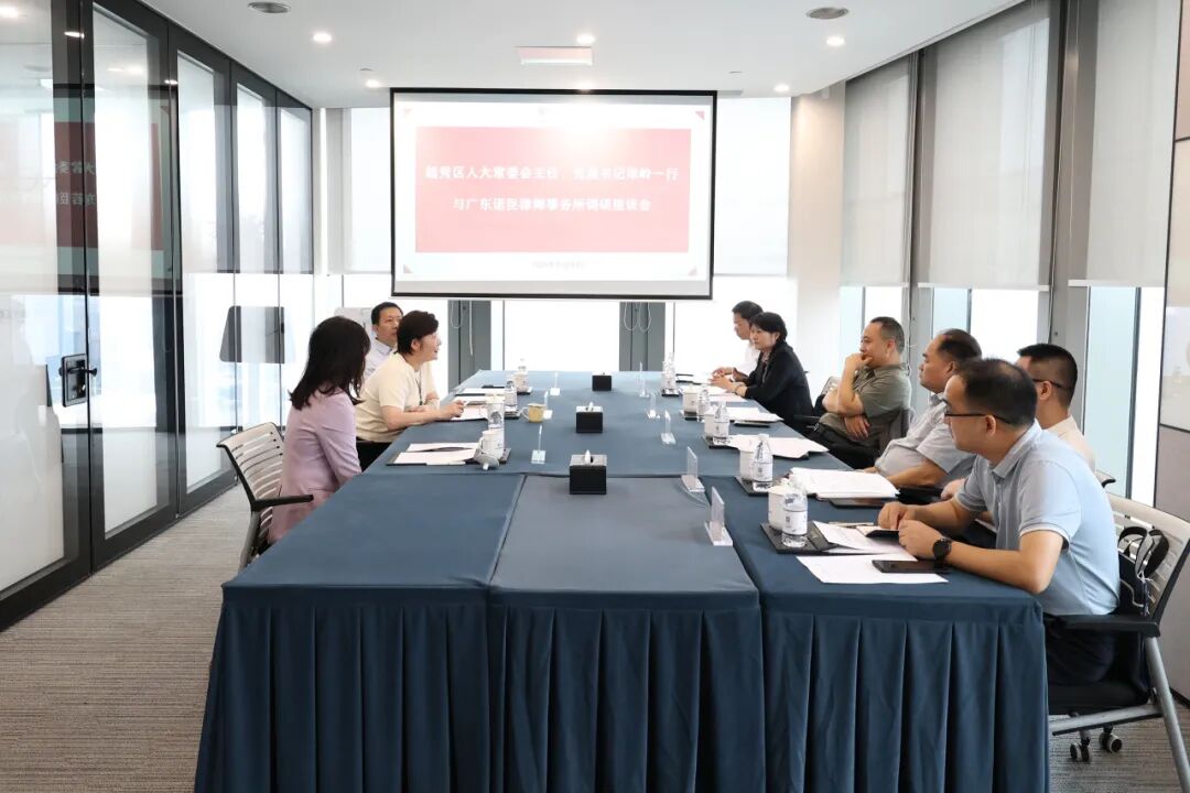 2026年3月26日上午,越秀区人大常委会党组书记、主任梁岭,区人大常委会党组成员、副主任许波,区人大常委会党组成员、办公室主任、一级调研员吴丽灵,越秀区人大常委会代表工委主任许承,黄花岗街道人大工委主任陈豪轩等一行莅临广东诺臣律师事务所(以下简称 “诺臣所”)开展调研指导工作。诺臣所合伙人会议主席、越秀区人大代表官选芸律师,监事会主席、广州市人大代表雷建威律师,管委会常务副主任兼行政总监、越秀区人大代表王静律师等热情接待并参与座谈,本次会议由王静律师主持。