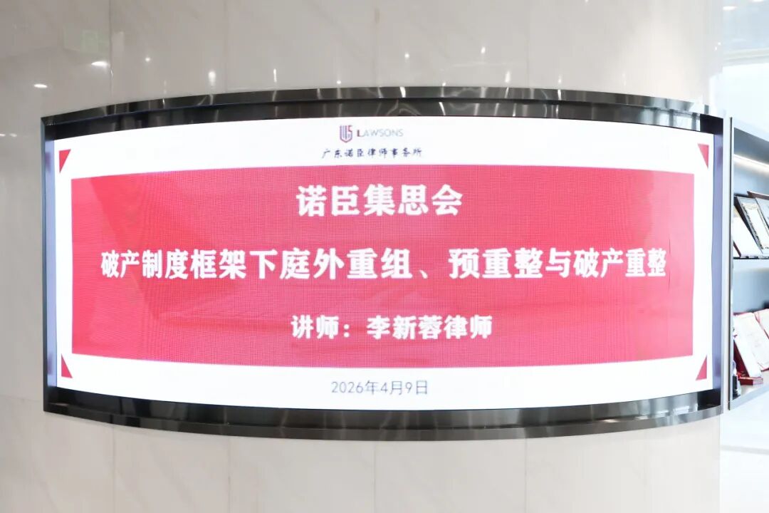 2026年4月9 日下午,广东诺臣律师事务所(以下简称“诺臣所”)集思会如期举行。本次集思会由李新蓉律师主讲,以破产制度框架下庭外重组、预重整与破产重整为主题,系统拆解企业破产救治的核心规则、程序差异与实务操作要点。合伙人刘珒律师及一众同事积极参加。