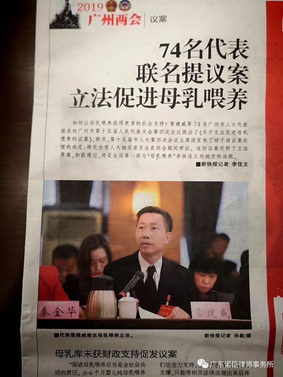 2019年1月15日,广东诺臣律师事务所雷建威律师等74名广州市人大代表联名向广州市第十五届人民代表大会第四次会议提交了《关于立法促进母乳喂养的议案》,这个议案成为了本次大会唯一符合法定条件的代表议案,大会主席团决定交由相关委员会在闭会期间审议。该议案附了立法草案,如立法最终获通过,这将是全国第一部为“母乳喂养”单独设立的地方性法规。