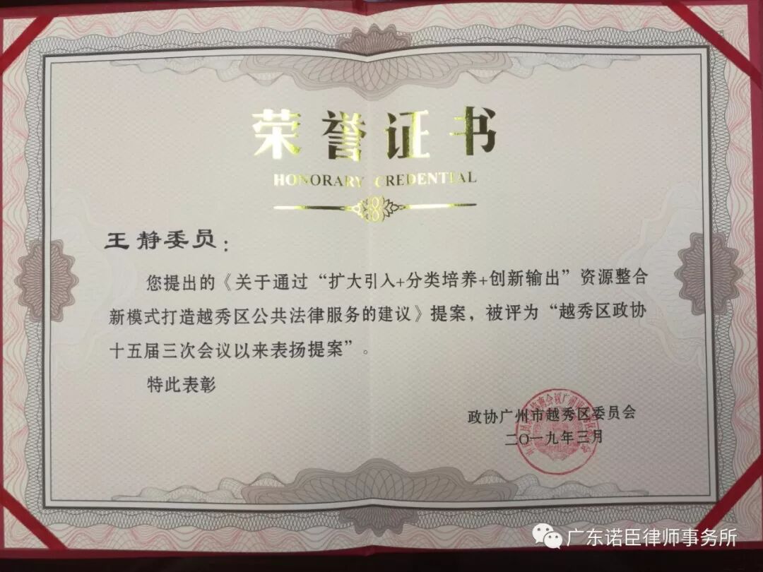 诺臣动态 | 祝贺我所王静律师提案荣获“越秀区政协十五届三次会议以来表扬提案”奖