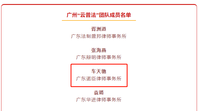 为进一步优化普法人才智库,继续发挥广州“云普法”团队在推进新时代普法工作高质量发展方面的积极作用,市司法局对“云普法”团队成员进行调整,广州共有33名律师在新名单内,其中诺臣所的合伙人车天驰律师成功入选!