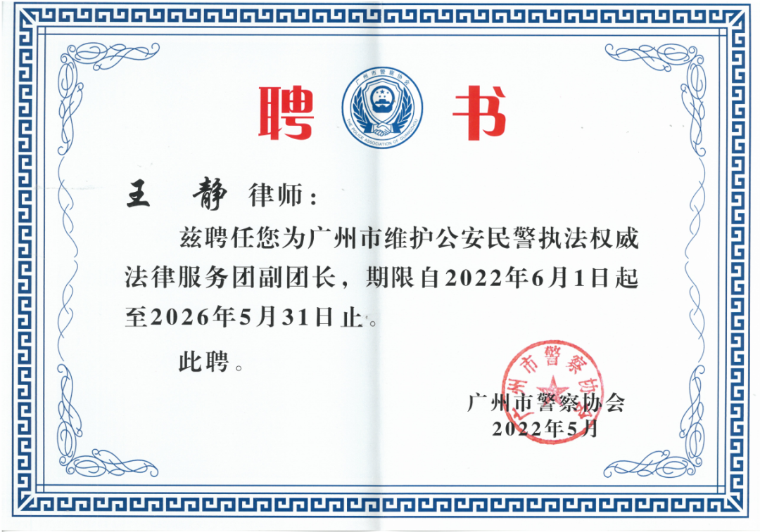近日,广东诺臣律师事务所(以下简称为“诺臣所”)管委会副主任、高级合伙人王静律师获聘广州市维护公安民警执法权威法律服务团副团长,期限自2022年6月1日起至2026年5月31日止。